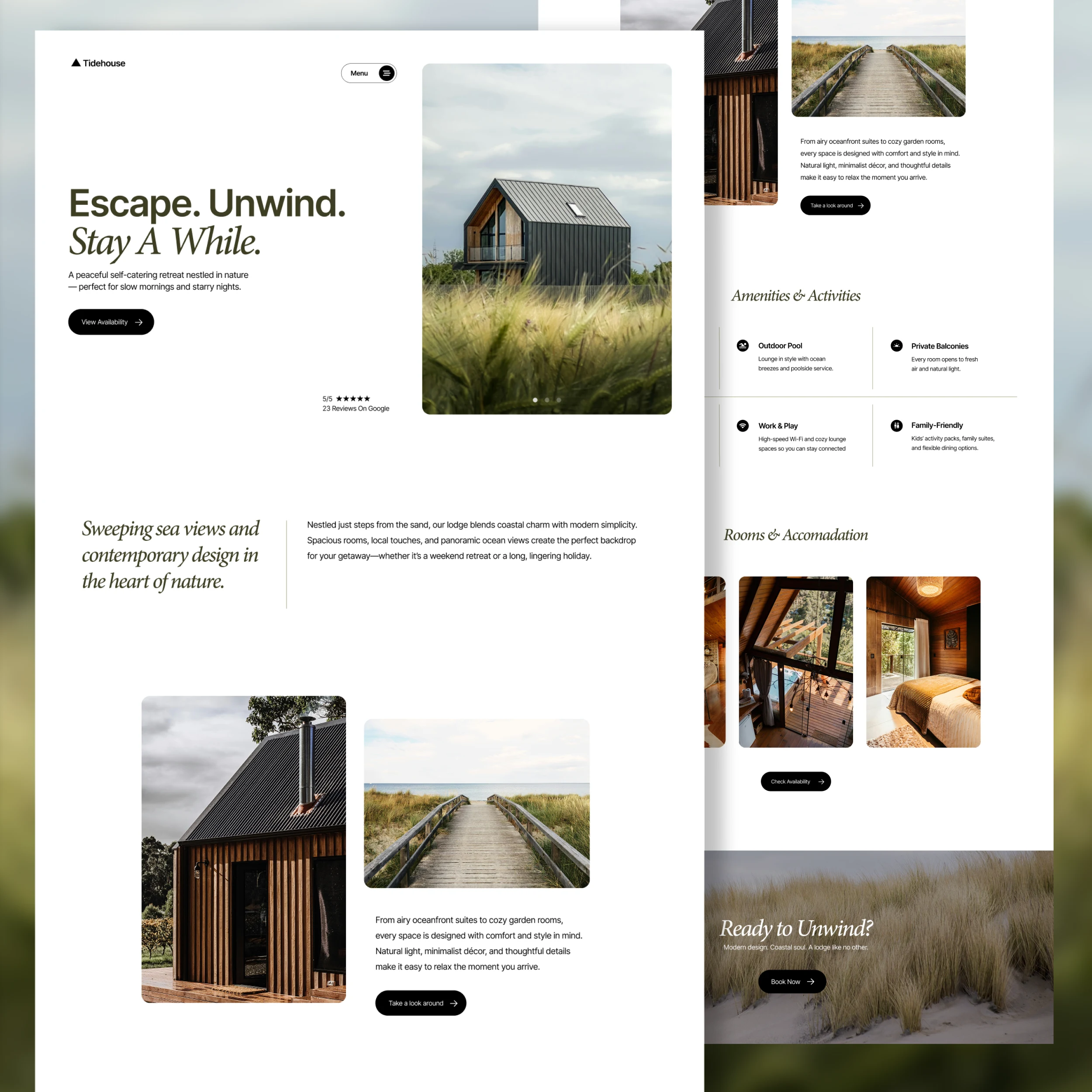 Tidehouse is a modern, contemporary guest house located near the beach, designed for visitors seeking a calm, refined stay. The website reflects this atmosphere through a super minimal design, with generous white space and sharp, high-quality imagery that highlights the property’s unique character and coastal surroundings. Built in Framer, the site emphasizes simplicity and ease of use, offering a seamless browsing experience that feels as fresh and inviting as the guest house itself.