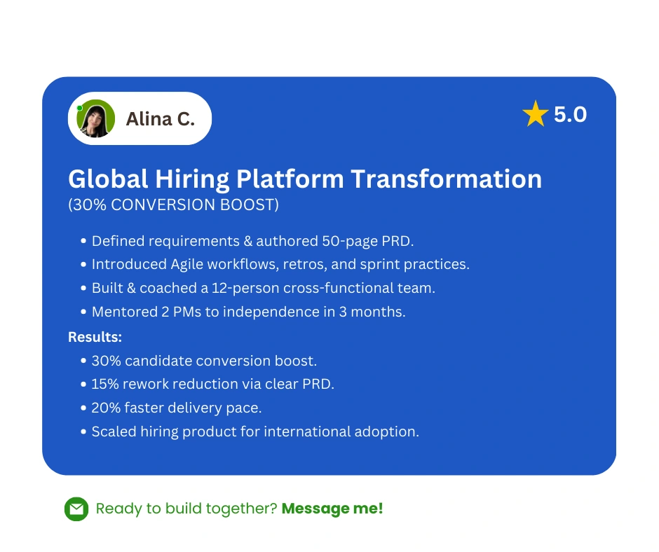 Led end-to-end delivery of global hiring platform. Improved candidate conversion, streamlined hiring flows, onboarded PMs, scaled product for the rollout.