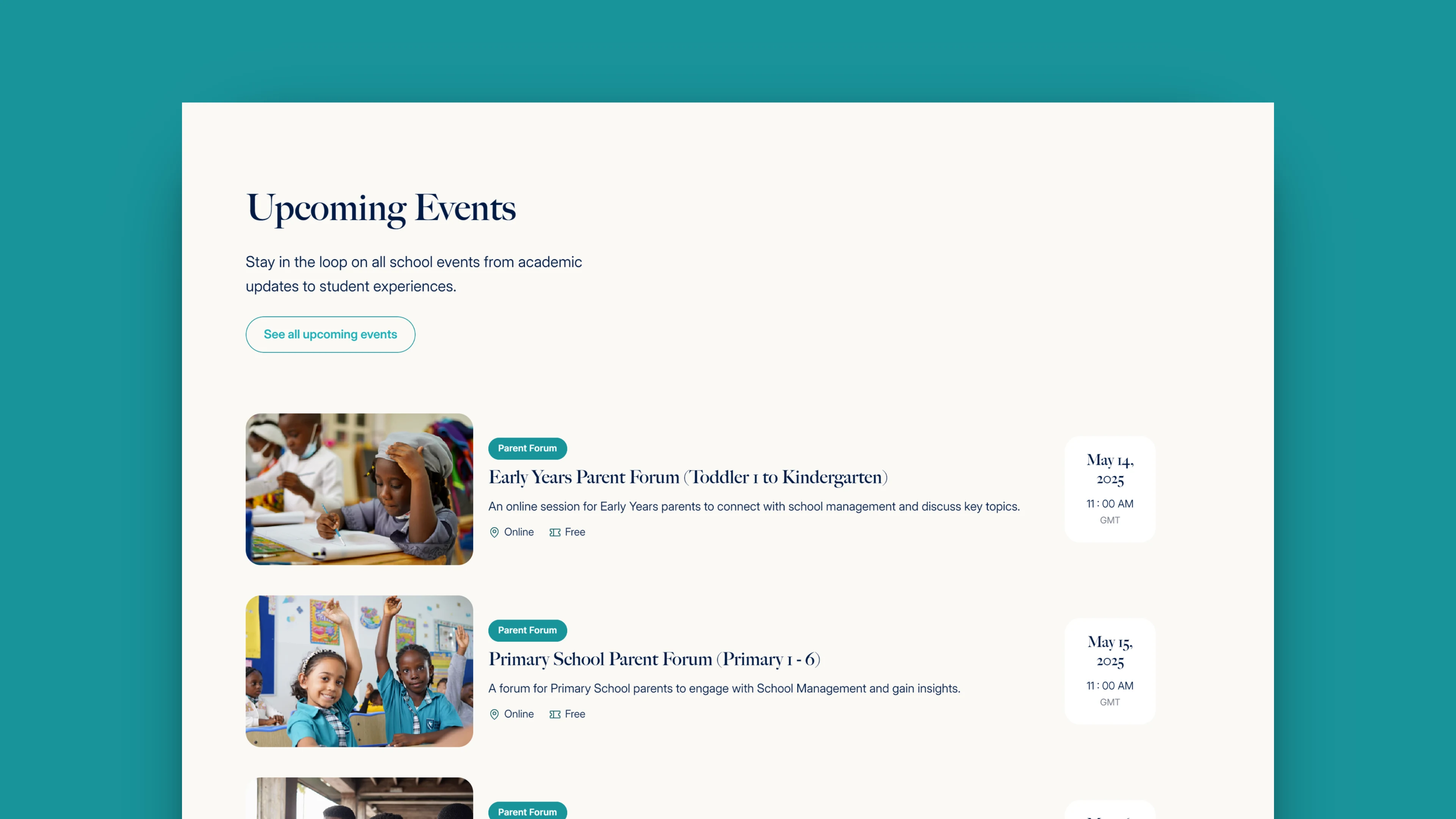 • Integrated a load-more events list with date/time cards and a “Schedule a Visit” call to action