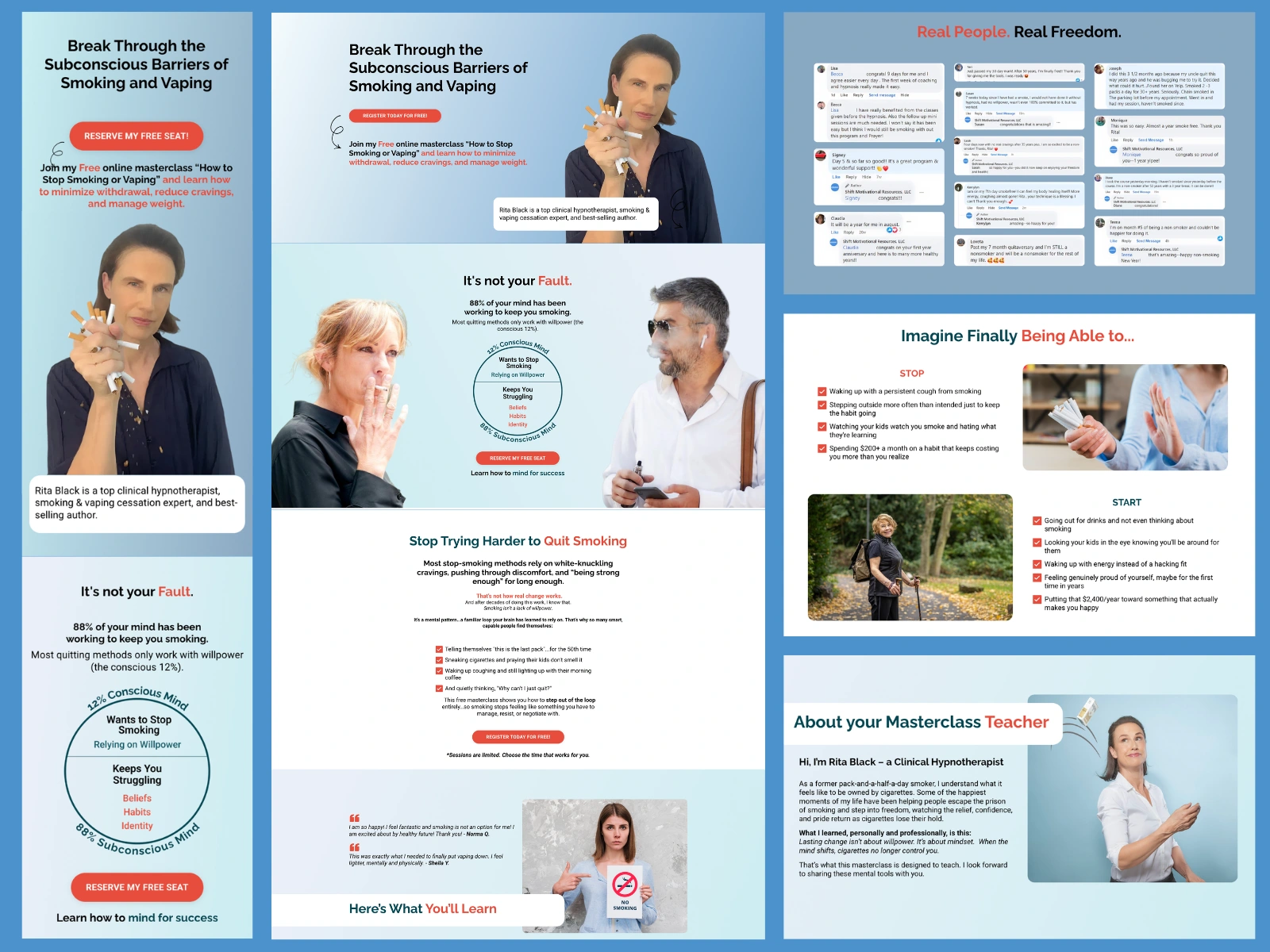 Rita Black is a US-based clinical hypnotherapist and best-selling author running two separate coaching brands – one focused on smoking and vaping cessation (Smoke Free 123), and one on weight loss through hypnosis (Shift Weight Mastery). Both brands run evergreen webinars as their primary lead generation funnel, and both needed stronger, higher-converting Kajabi landing pages.