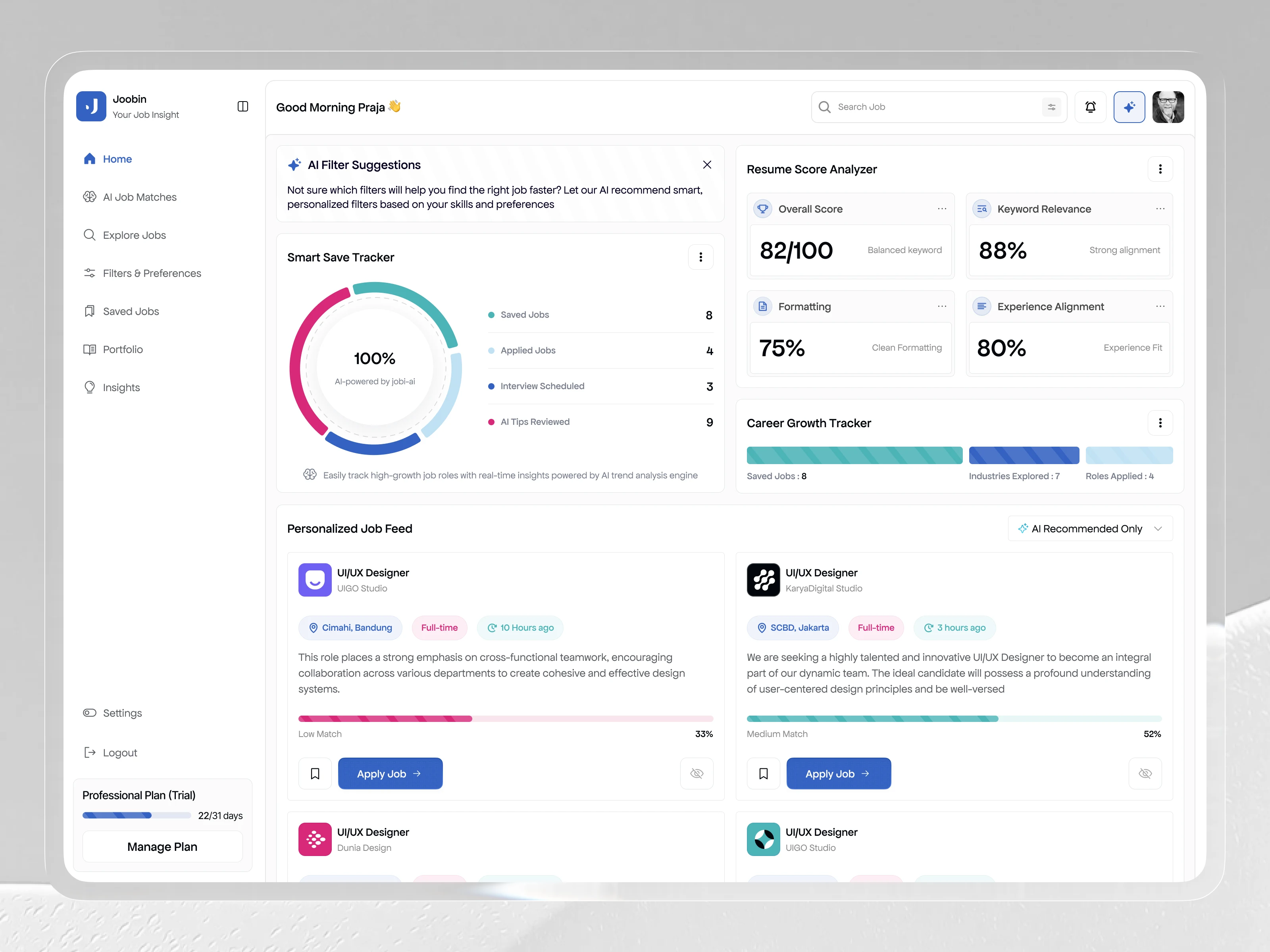 A comprehensive job seeker dashboard for Joobin. Features an intuitive SaaS UI/UX to manage applications, track alerts, and organize career progress.