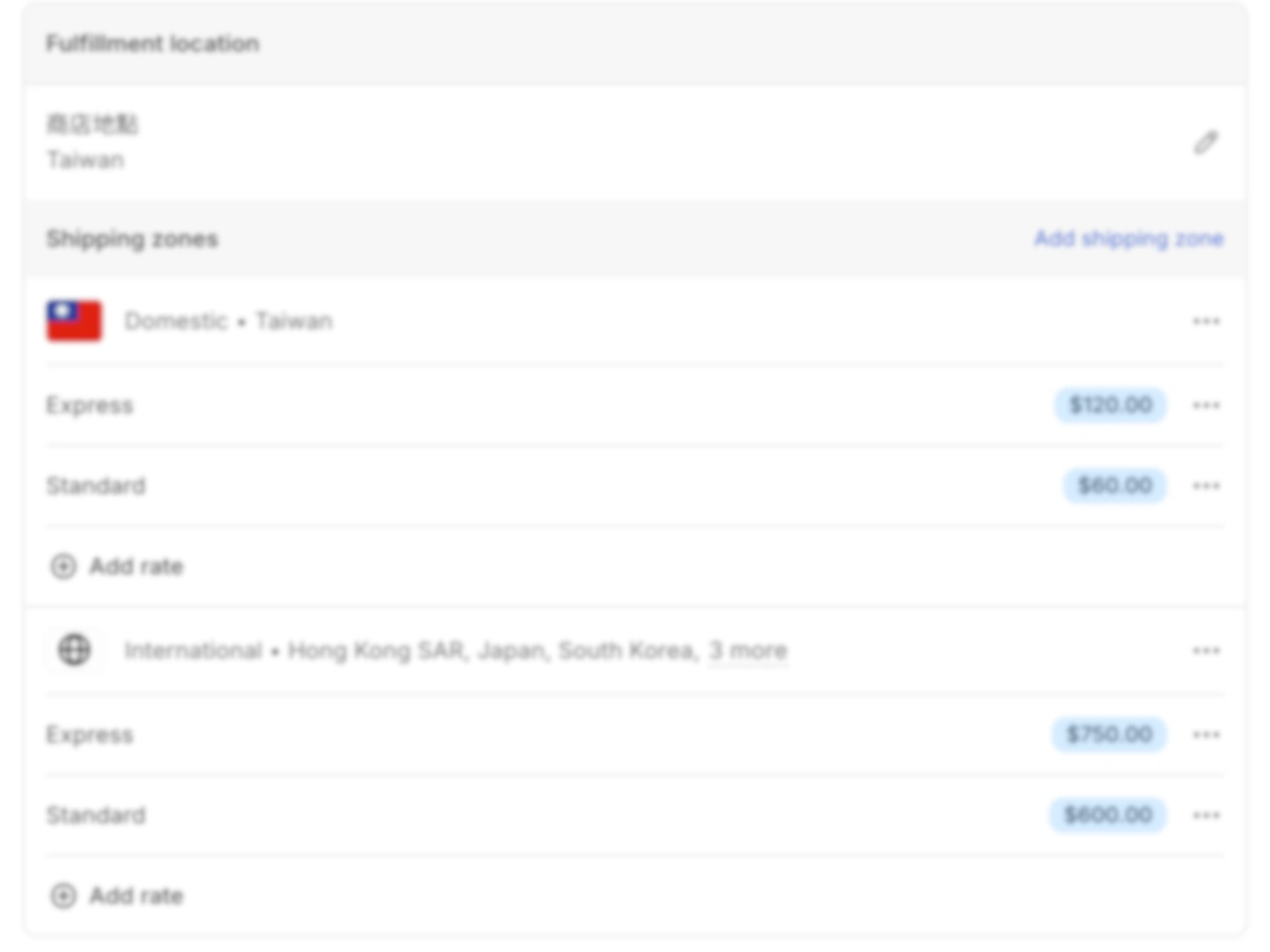 I configured a complete Shopify shipping logic covering Taiwan domestic shipments and multiple international regions.
