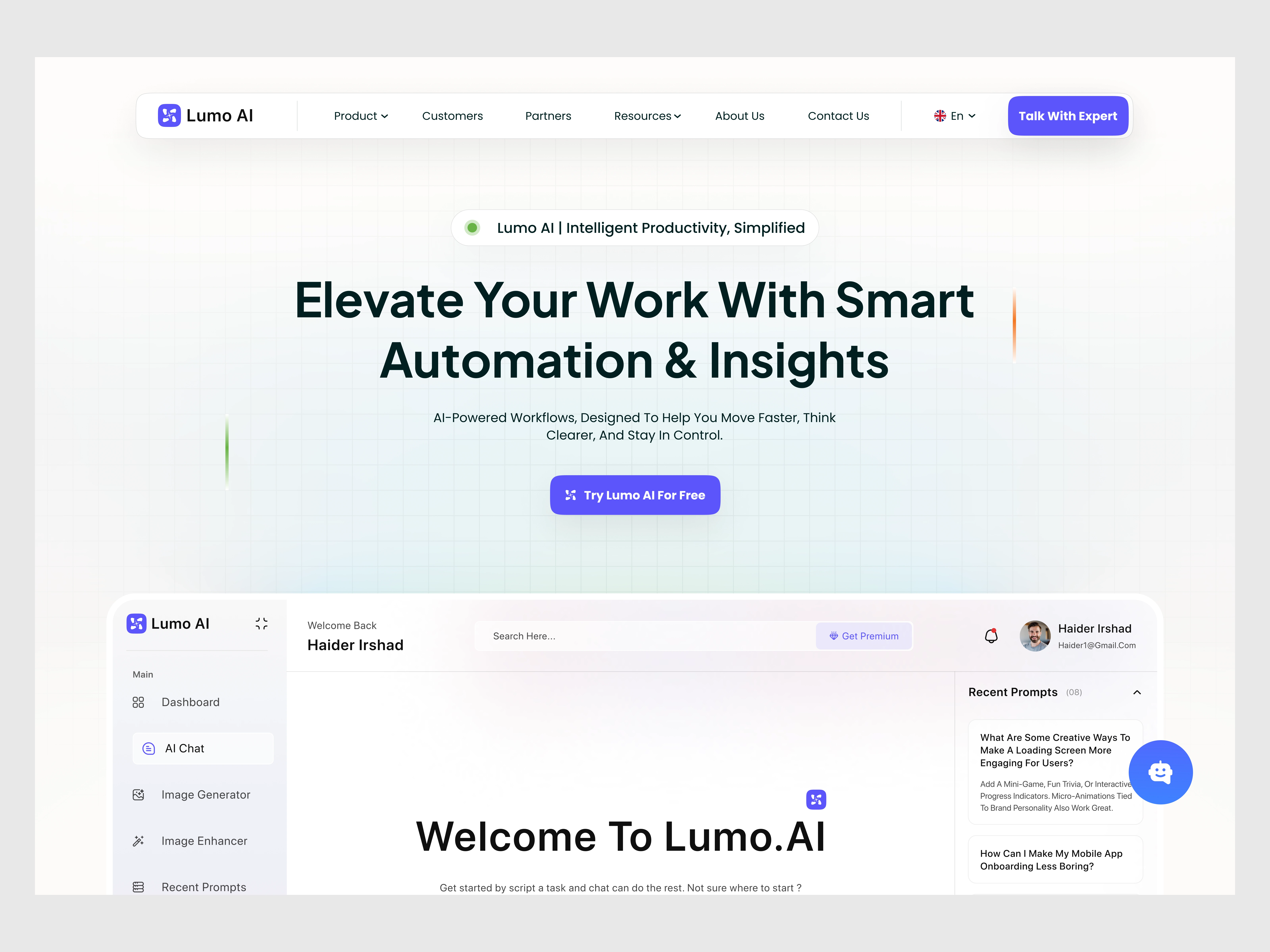 Here’s a clean and modern landing page concept I designed for Lumo AI — an AI-powered productivity platform that helps teams and professionals automate workflows, unlock instant insights, and accelerate outcomes.