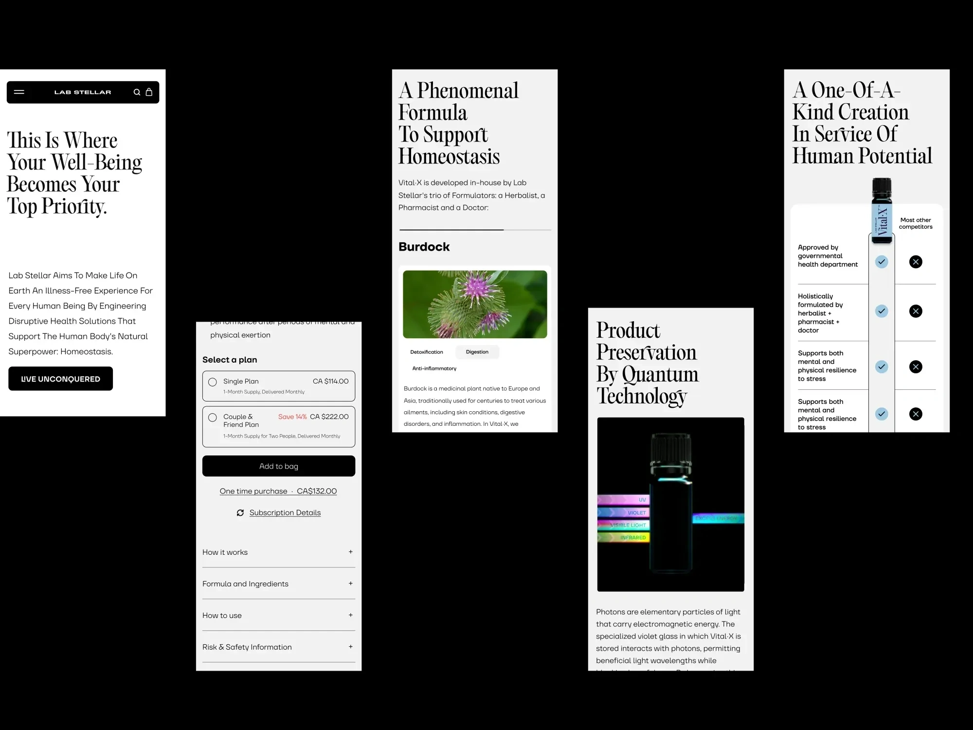A full brand development project for Lab Stellar - an adaptogenic liquid supplement company. I built their positioning, storytelling, visual identity, and e-commerce website, creating a bold, futuristic brand inspired by scientific innovation. The result: a standout identity that blends research credibility with striking, immersive design