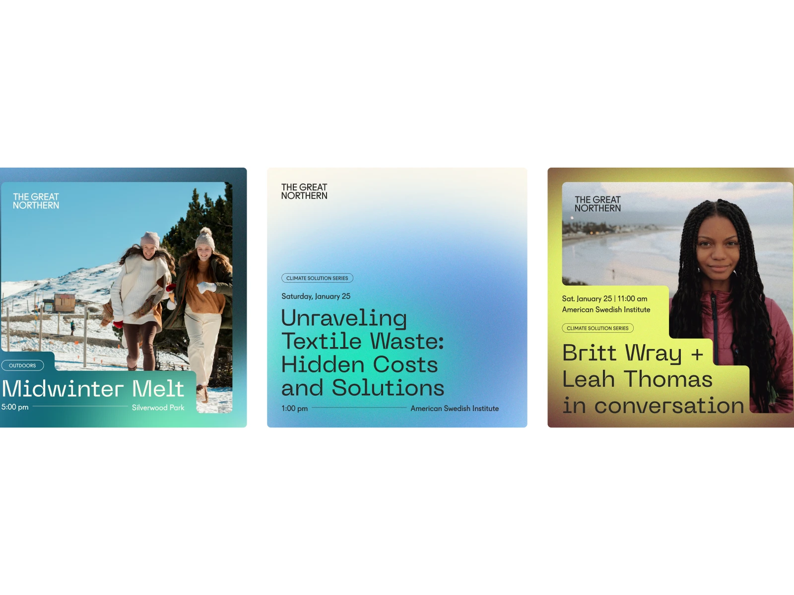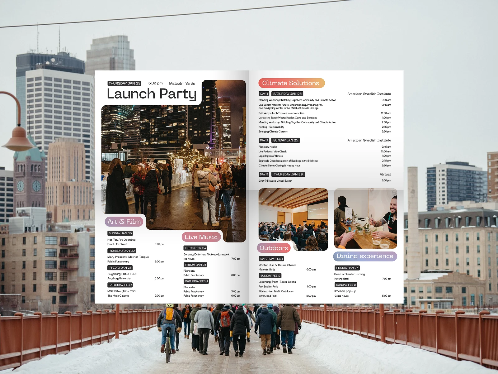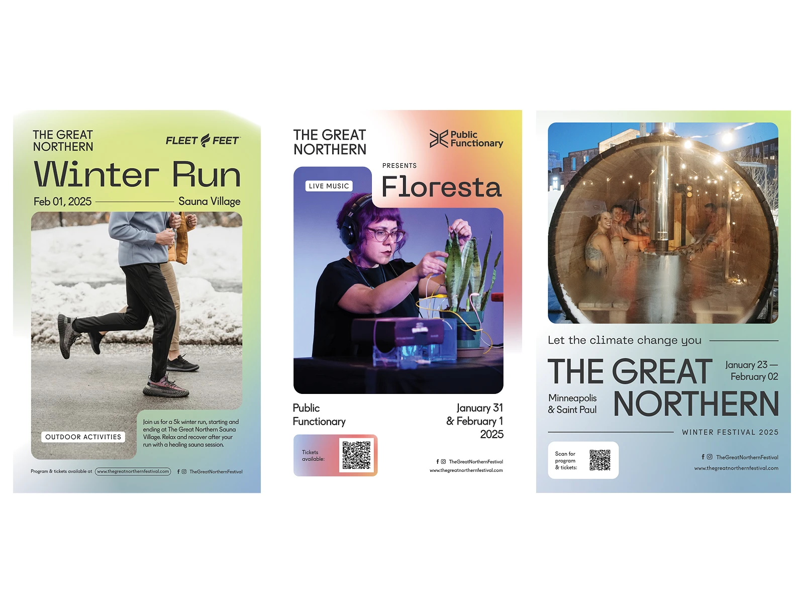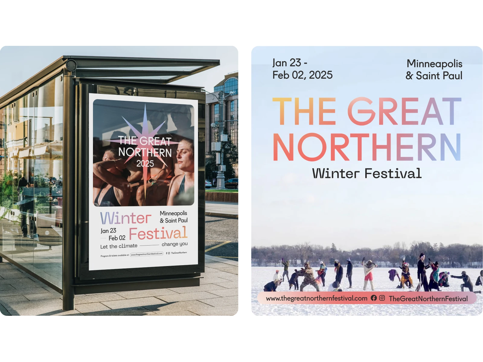 The Great Northern Festival, an annual 10-day winter celebration across Minneapolis and Saint Paul, sought to enhance its 2024/2025 event branding to reflect its mission of inspiring conversations, fostering community, and celebrating the unique climate and culture of the region. Under the direction of Marketing Manager Brianna Low, the festival required a cohesive suite of marketing materials, including event branding, billboards, printed materials, and maps, to effectively engage attendees and promote the festival's diverse programming. They engaged RNR Studio to develop a comprehensive visual identity and collateral that would encapsulate the festival's spirit and facilitate a memorable attendee experience.
