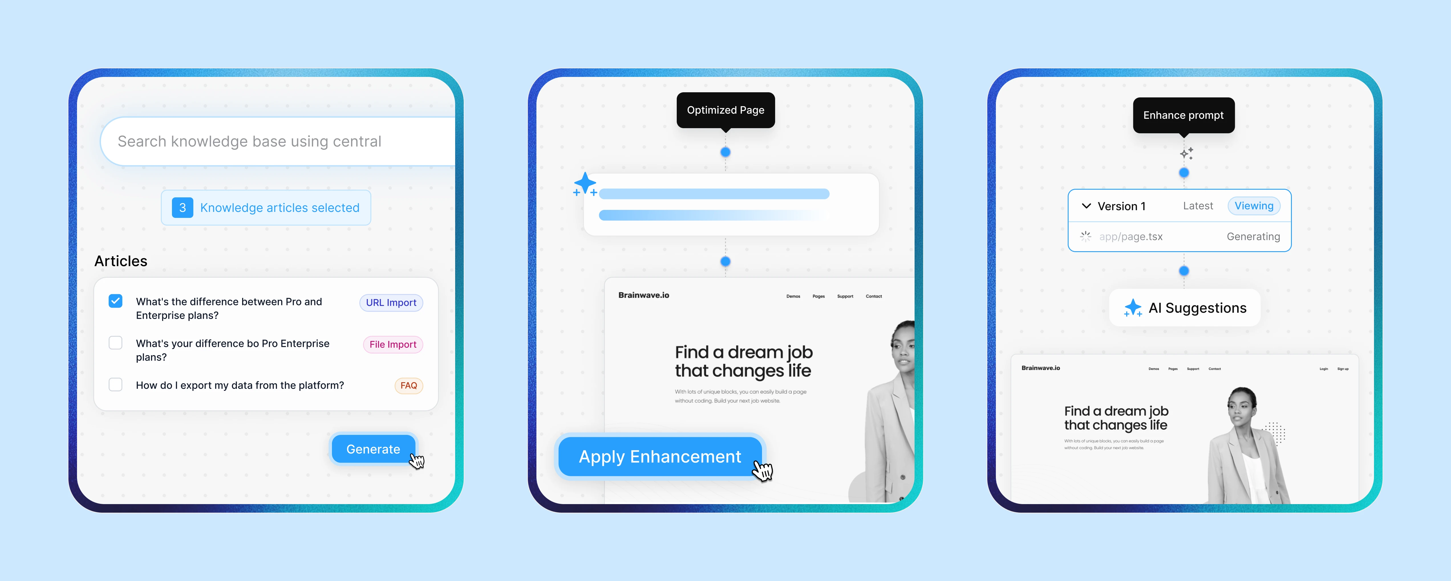 The graphics were designed to visually simplify complex workflows through clean layouts and modern UI visuals. Using consistent spacing, soft gradients, and minimal design elements, the visuals help communicate product functionality clearly while maintaining alignment with the platform’s overall design system.