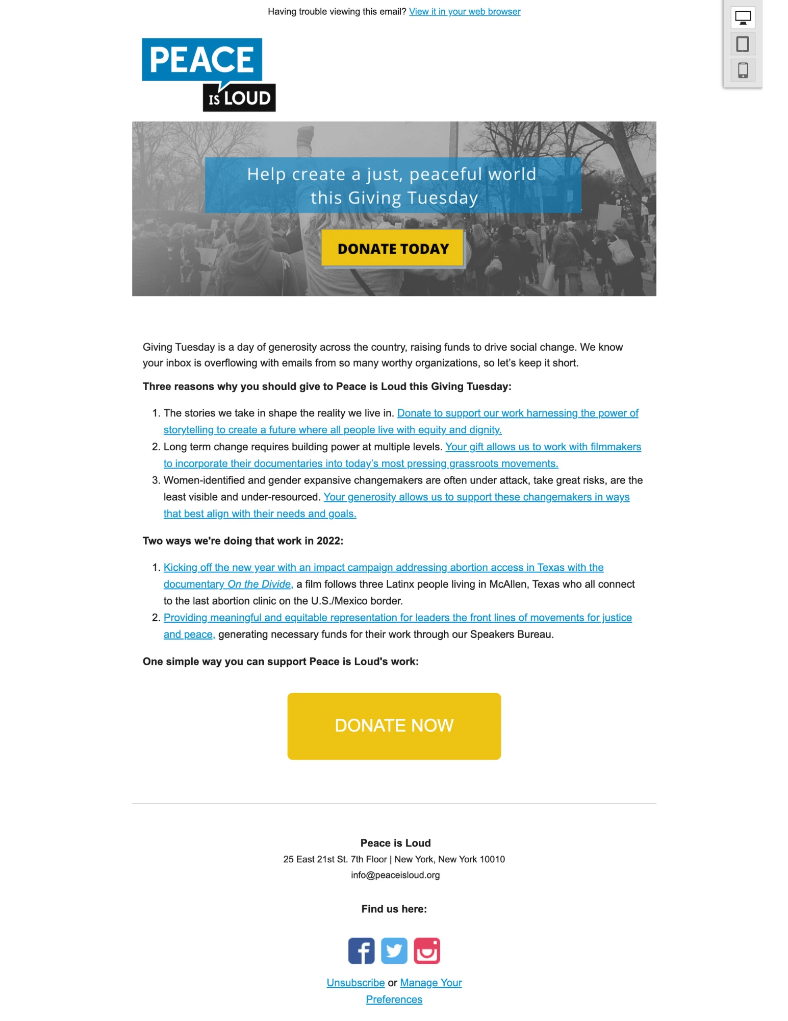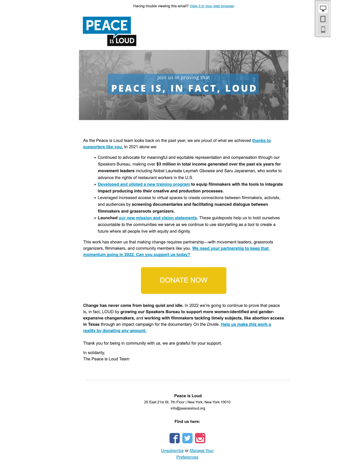 2021 fundraising campaign for the non-profit Peace is Loud, managed in Salsalabs.