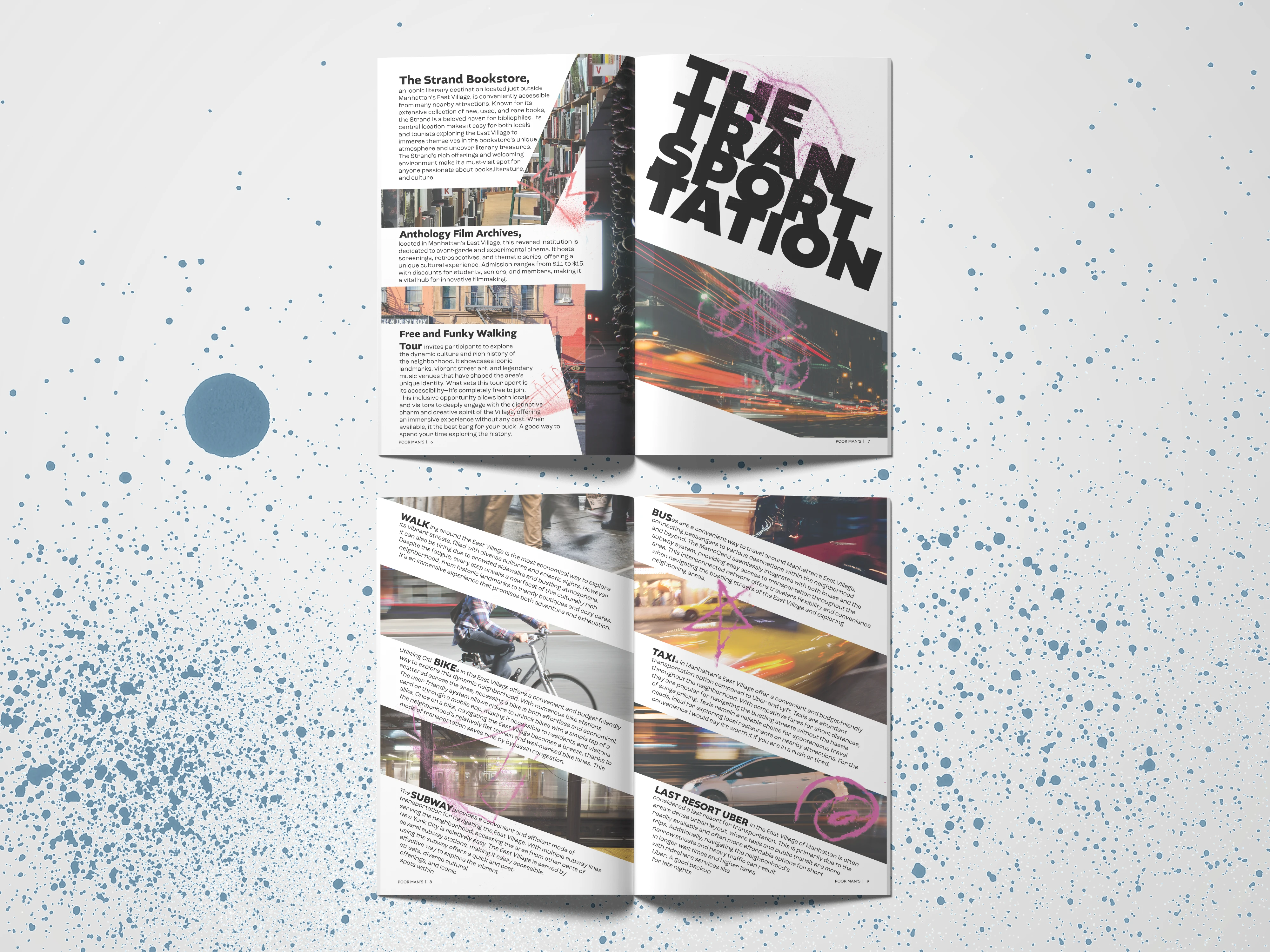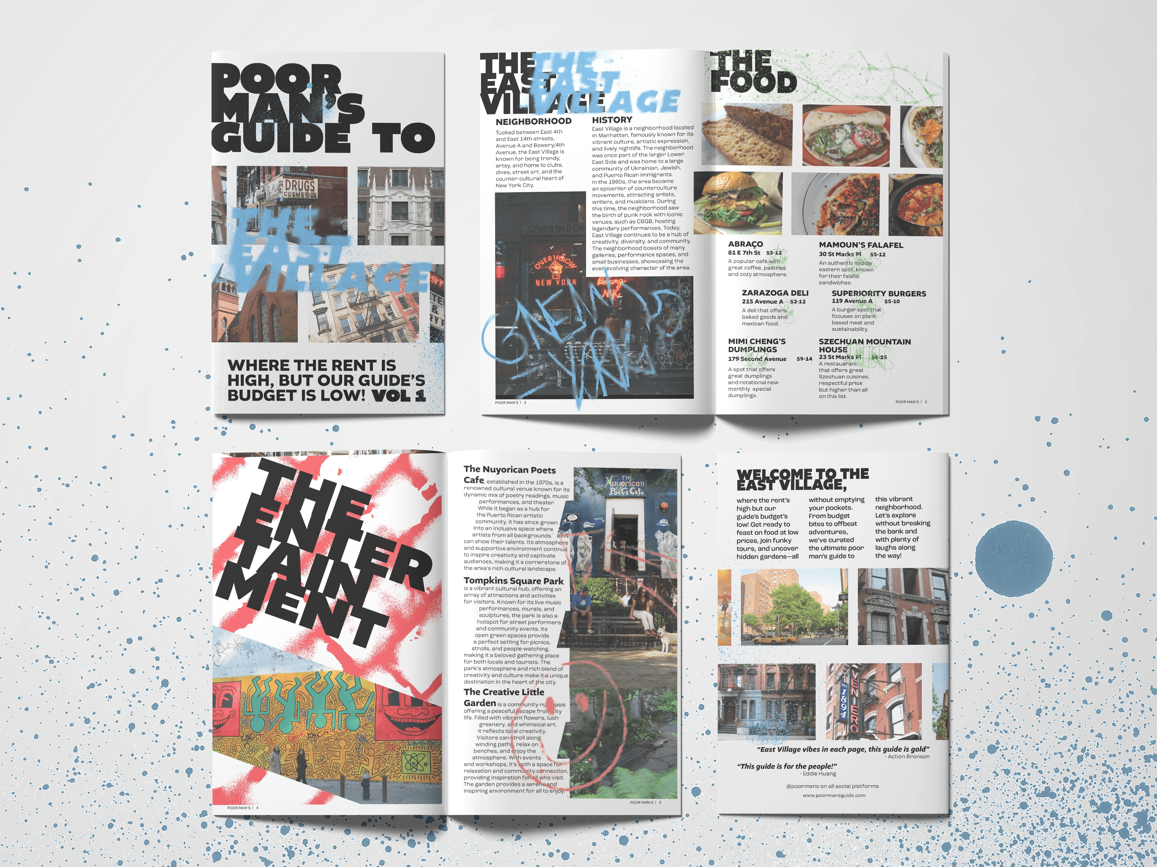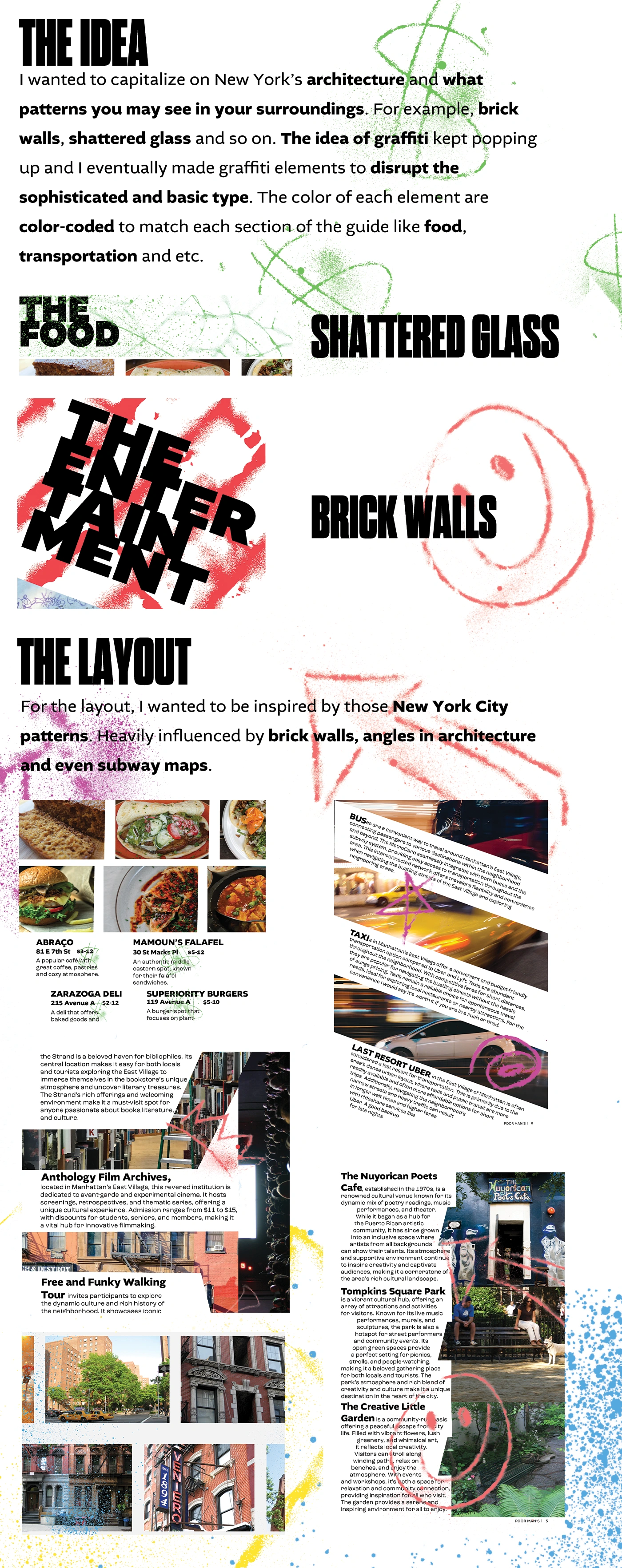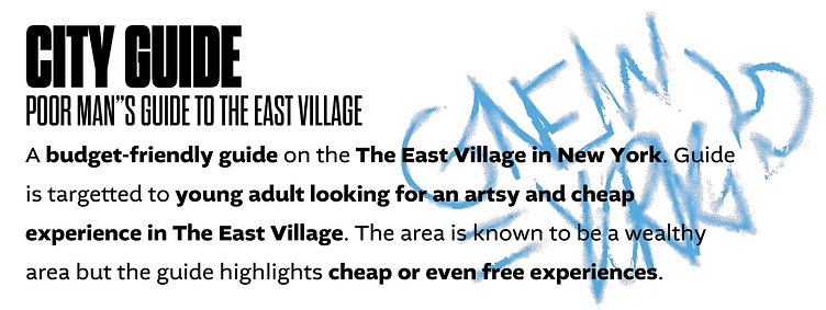 A budget guide to NYC's East Village for young adults, featuring cheap or free artsy spots. Color-coded tips for food, transit, shopping, and fun on a budget.