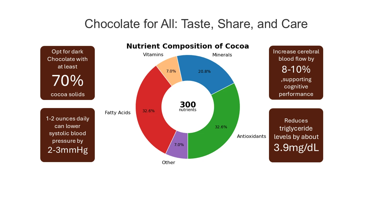 Simple showcase of the benefits of consuming chocolate; infographic made to assist with marketing to desired consumer segment.