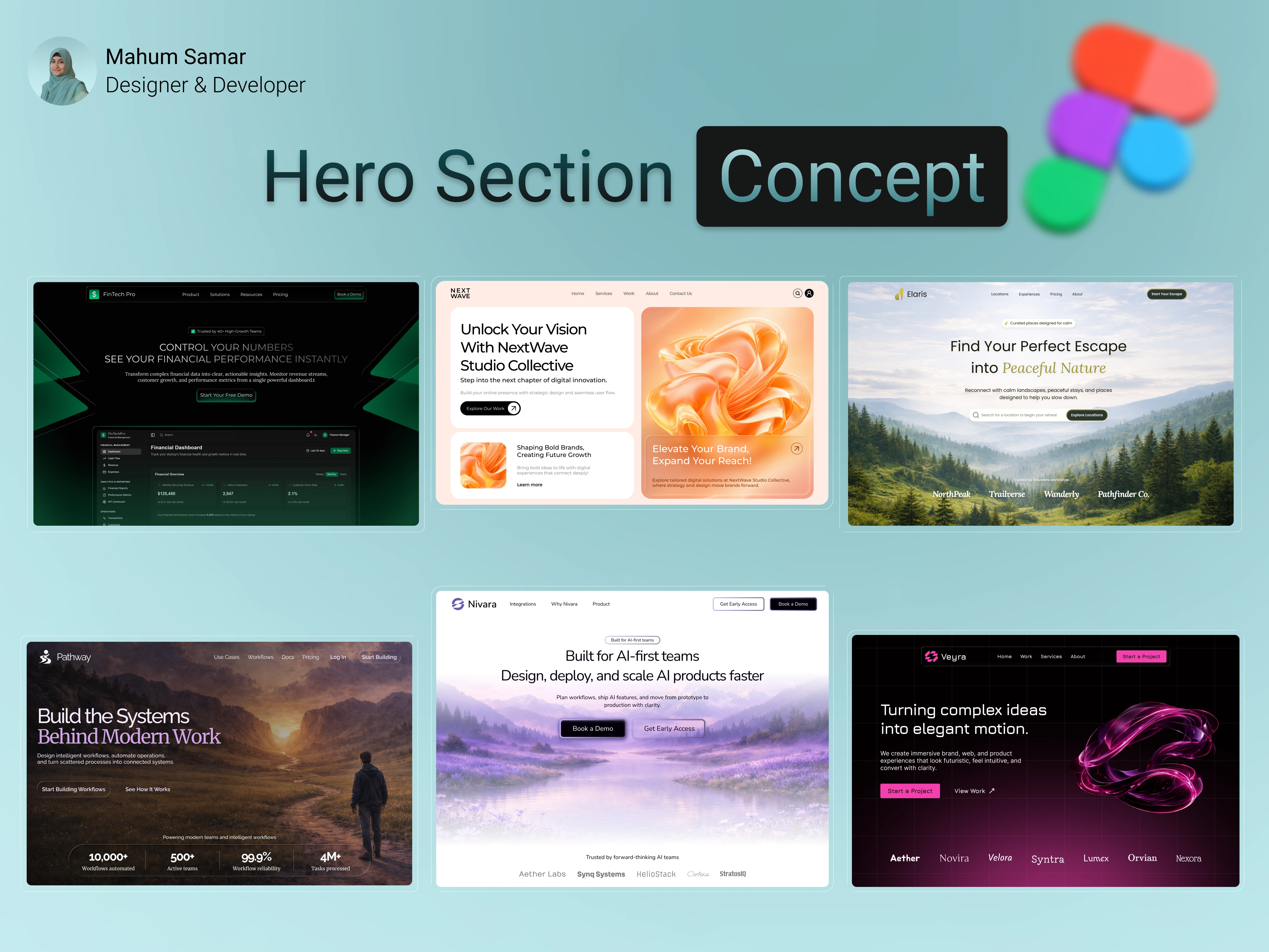 Designed a series of hero sections in Figma, exploring different styles, colors, and visual vibes.