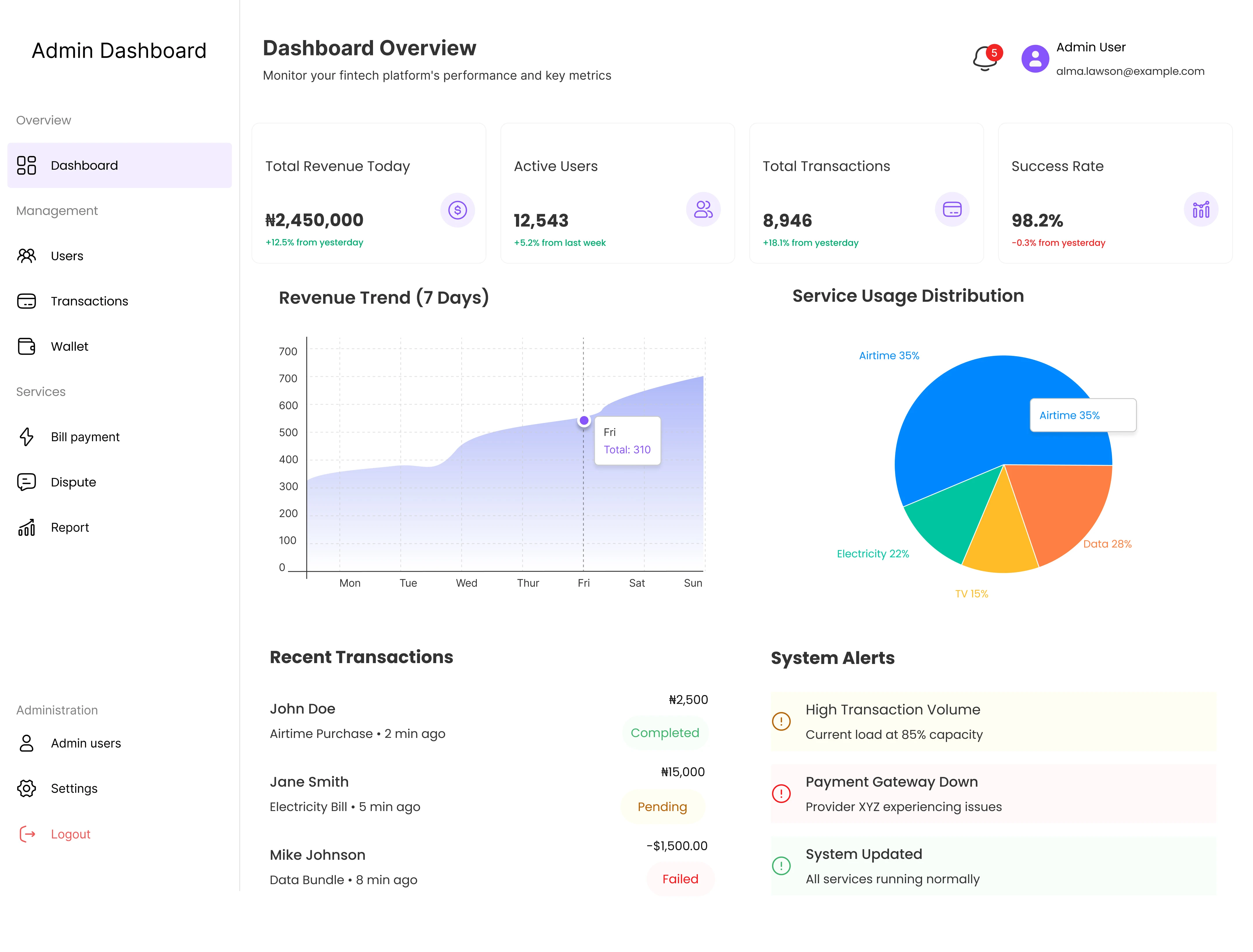 I designed an admin dashboard for a Nigerian bill payment app that enables users to pay for airtime, data, and utility bills.