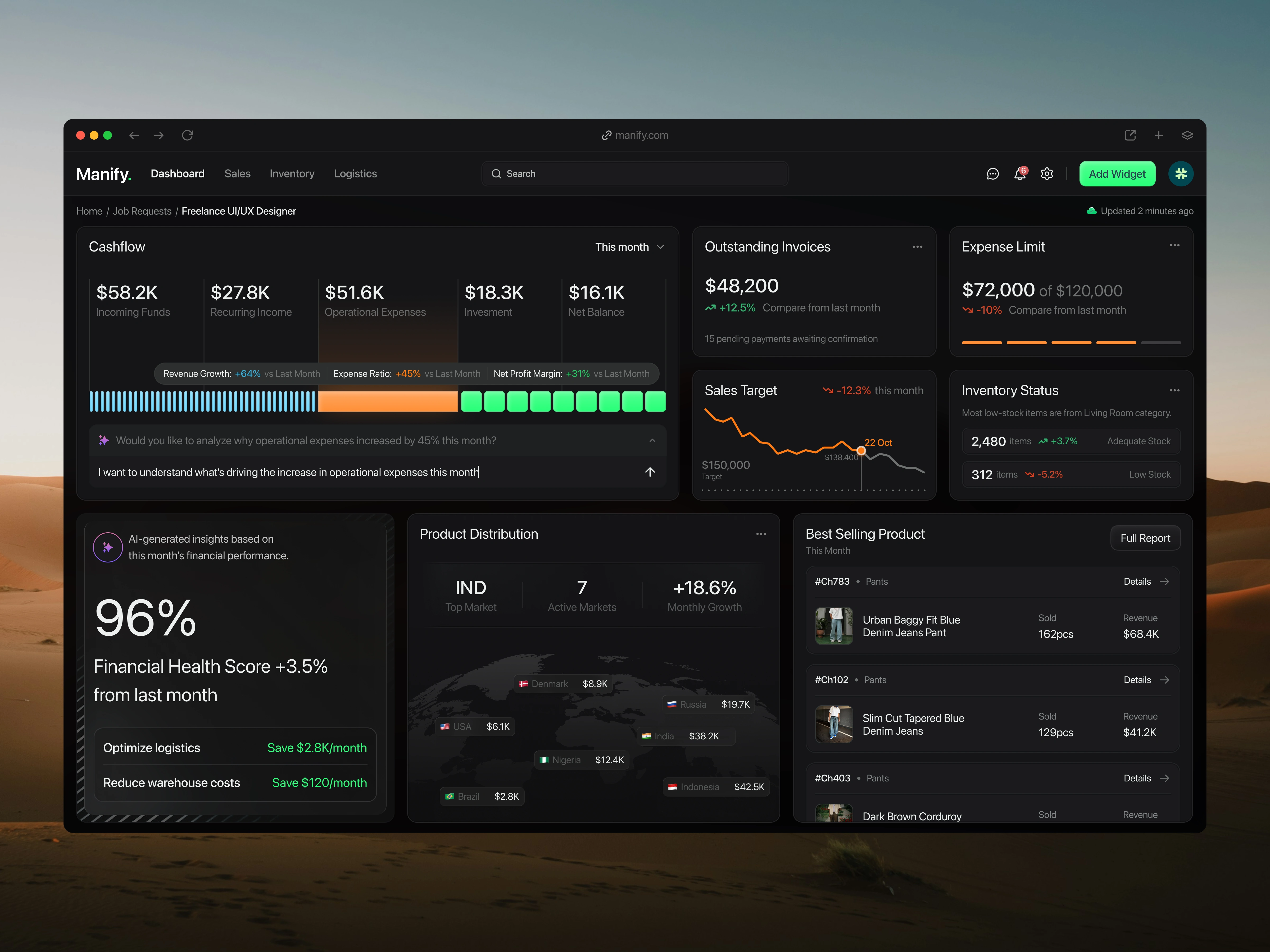 Manify CRM Dashboard is a next-generation financial and sales management platform tailored for enterprises and data-driven teams. The goal of this design is to centralize analytics, automate insight generation, and simplify performance tracking across multiple departments from cashflow and logistics to inventory and market distribution. With a dark UI aesthetic and well-structured data visualization, the dashboard enhances focus, readability, and executive decision-making.