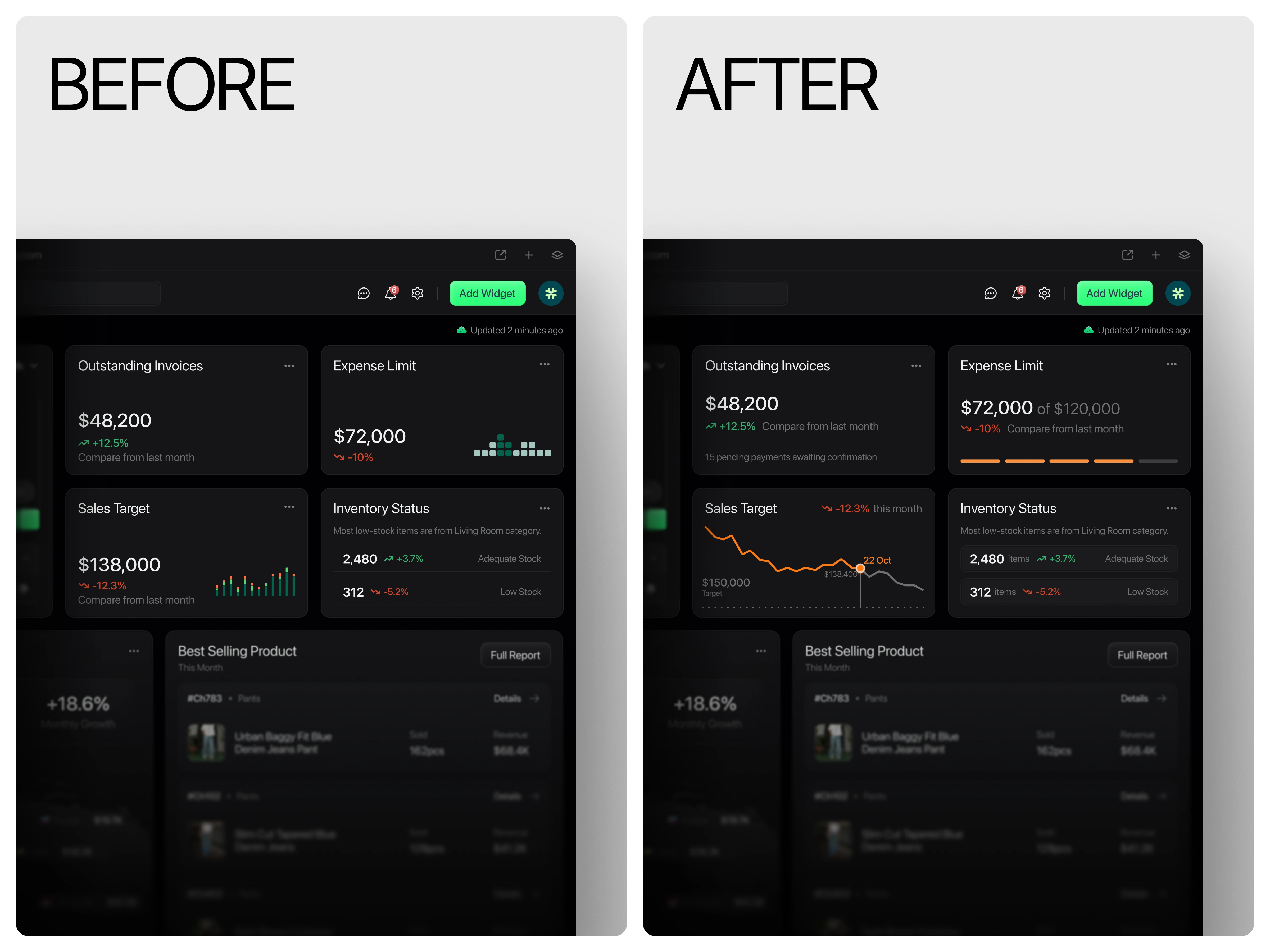 This increased cognitive load and made it harder to make quick, informed decisions. In the improved version, the charts have been updated to display clearer progress and trend visualization a line chart for Sales Target that reflects performance fluctuations over time, and a progress indicator for Expense Limit showing how much of the total budget has been used. These visual changes make the data easier to interpret at a glance, aligning the interface more closely with how users naturally understand progress and trends in real life.(src: Jakob Nielsen – 10 Usability Heuristics for User Interface Design)