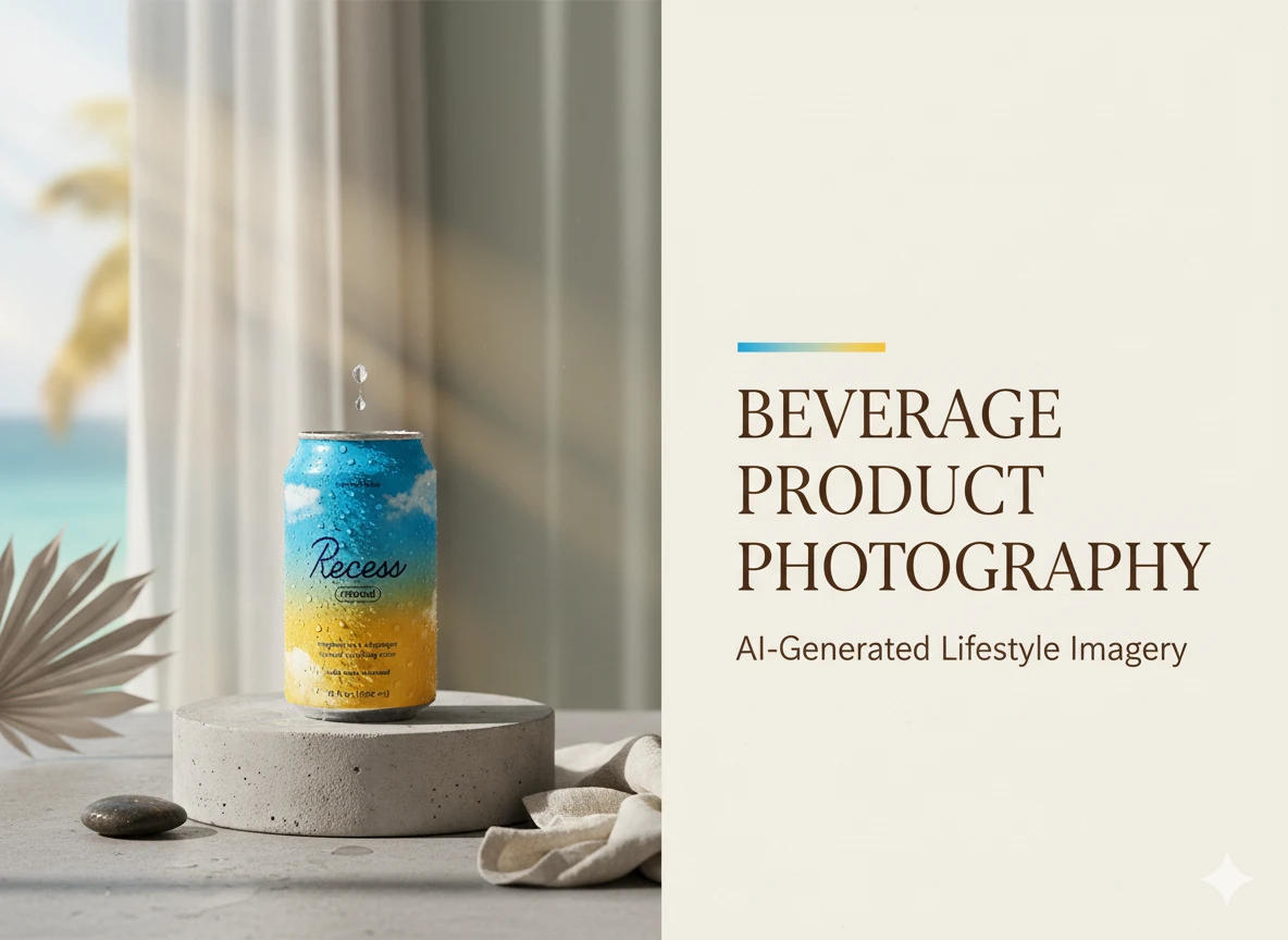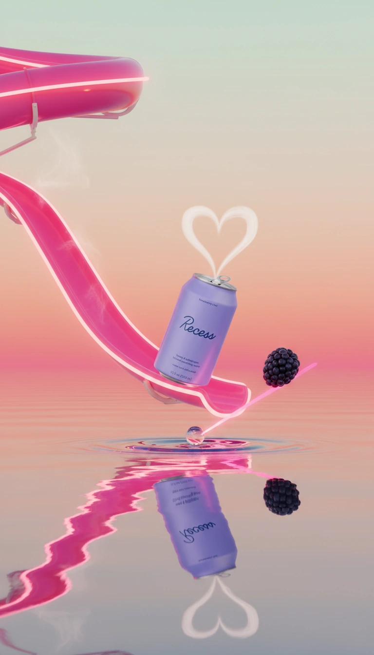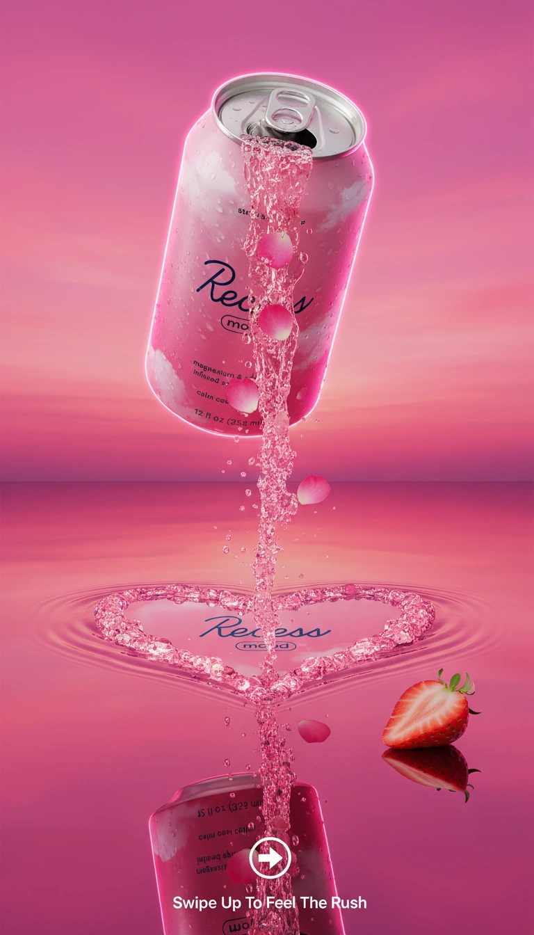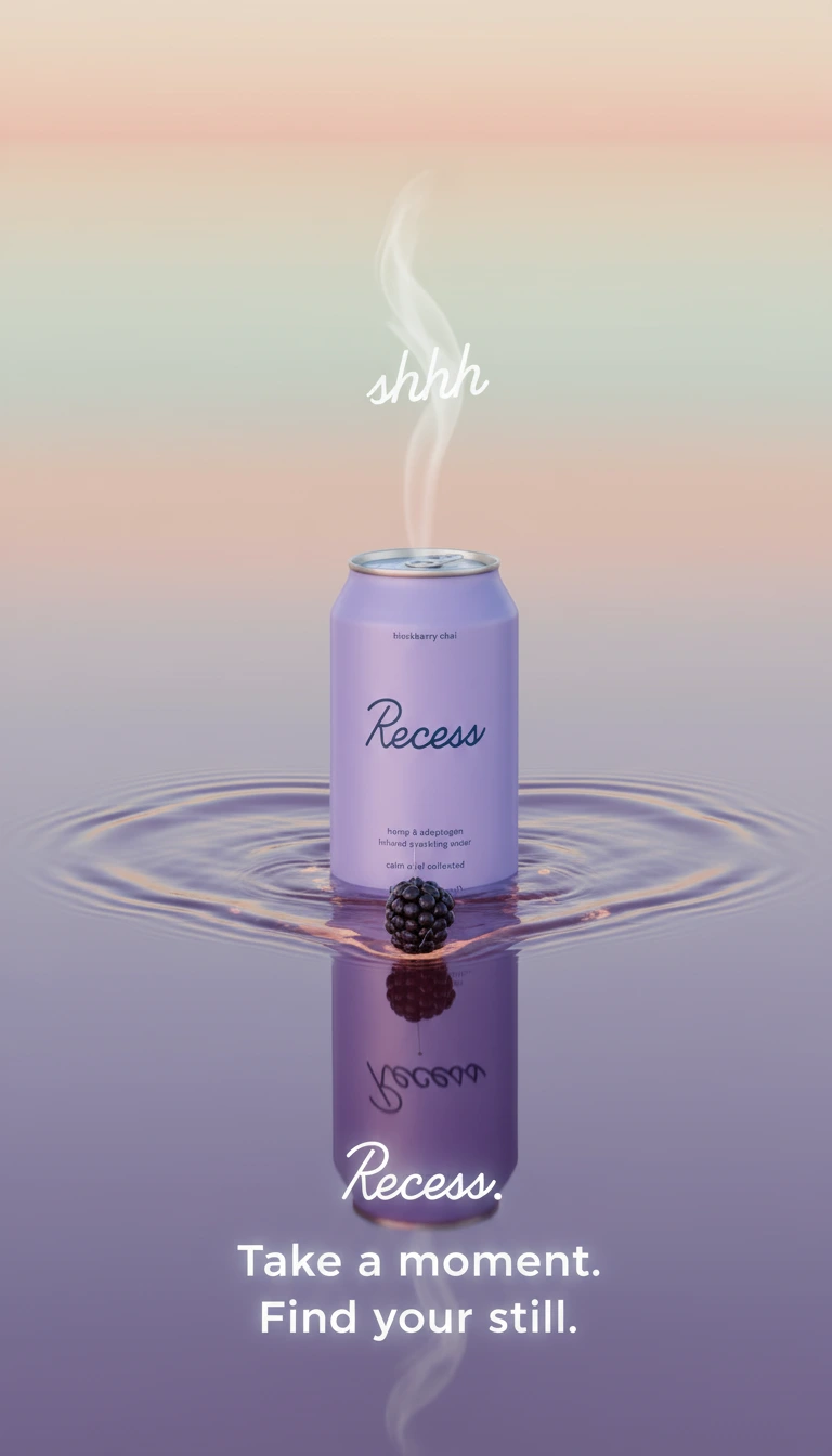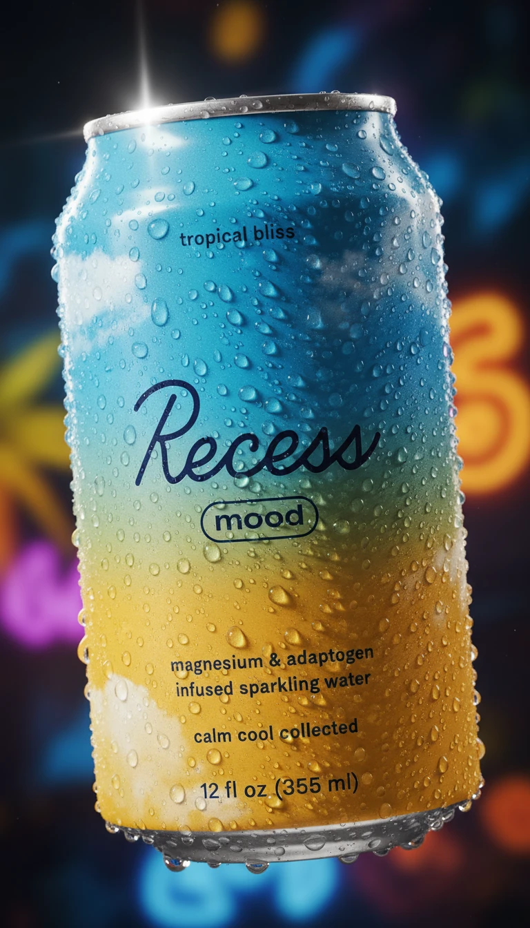 However, I noticed that while Recess has incredible product benefits (magnesium, adaptogens, mood support) and stunning packaging design, their visual marketing didn't always capture the emotional transformation these drinks provide. The existing imagery often showed the product in standard beverage photography contexts, missing the opportunity to showcase Recess as a lifestyle ritual and mindful moment facilitator rather than just another canned drink.
