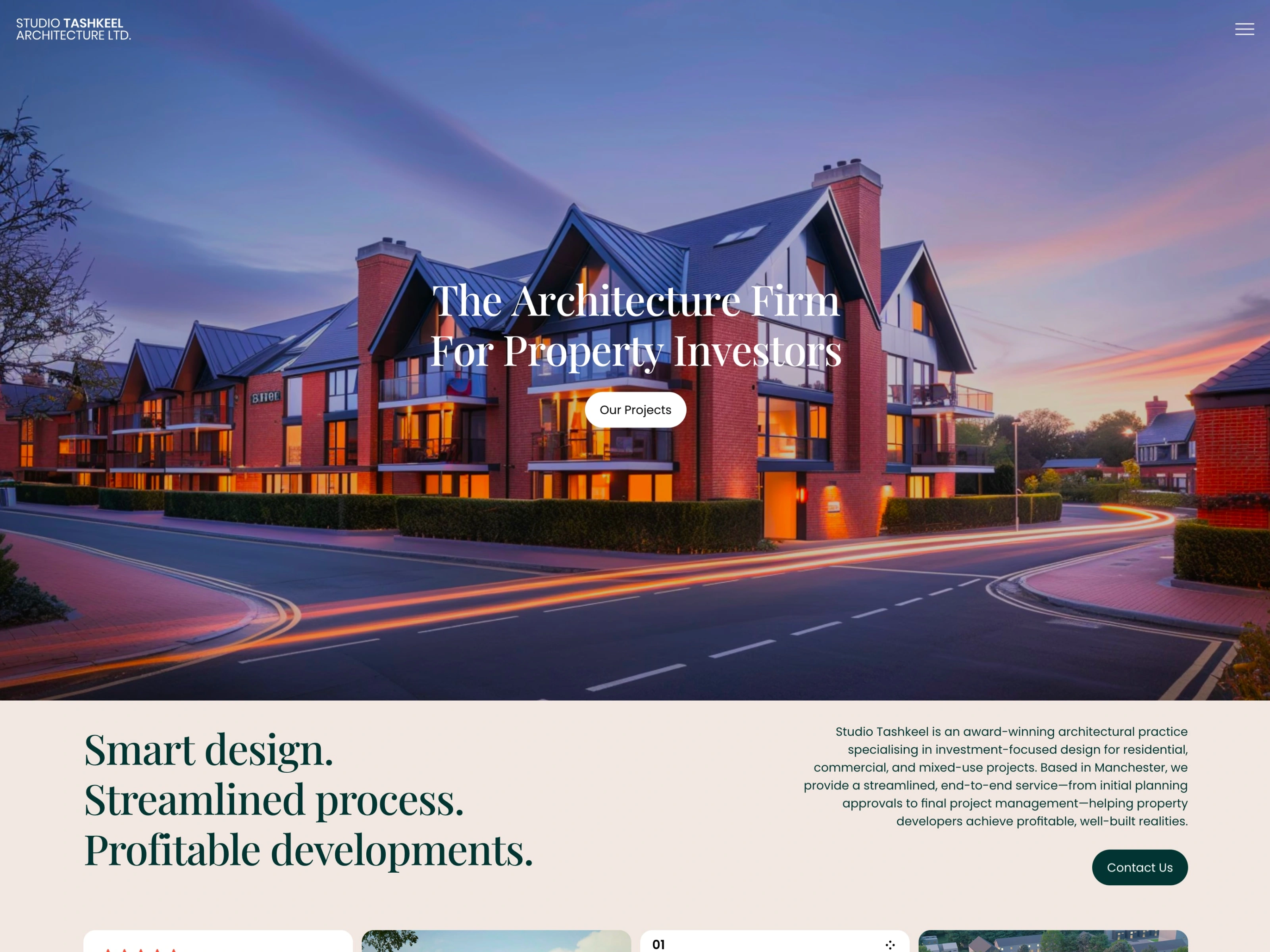 I led the end-to-end UX/UI design and website build, focusing on clarity, hierarchy, and brand alignment. The site structure was carefully planned to guide visitors through Studio Tashkeel’s services, philosophy, and selected projects with minimal friction. Visual balance, typography, and spacing were refined to create a calm, confident experience that reflects the studio’s architectural approach. The final website is fully responsive, easy to navigate, and optimized to communicate both creative excellence and business value.