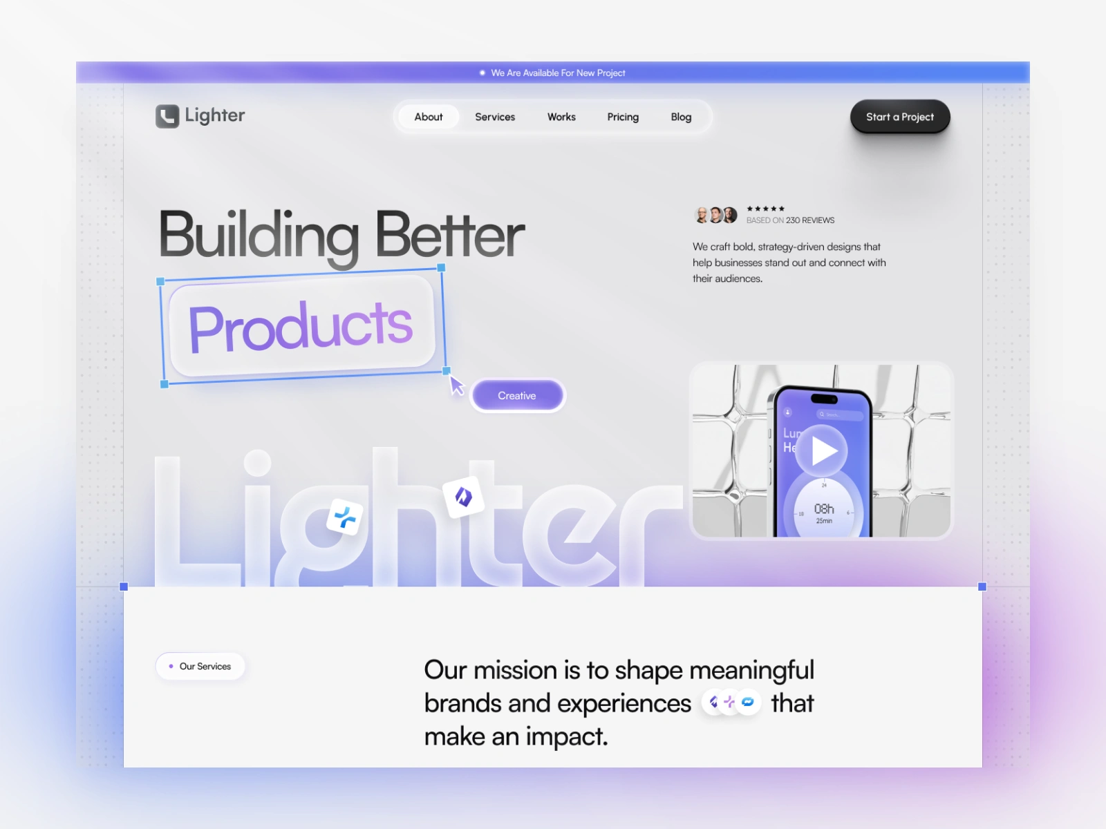 Lighter is a modern website crafted for creative agencies that want to express clarity, creativity, and visual sophistication. The goal was to design a clean, light-mode experience that still feels distinctive and memorable.