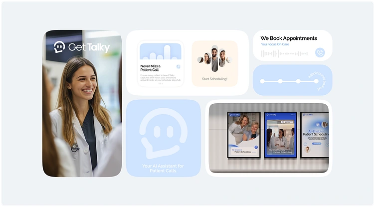 As a Senior Frontend / Product Engineer, I worked on Get Talky, an AI appointment scheduling platform for healthcare practices. The goal was to connect a friendly marketing site, multi-device product screens, and brand visuals into one cohesive experience so clinics can automate patient calls, bookings, and reminders while keeping a human feel.
