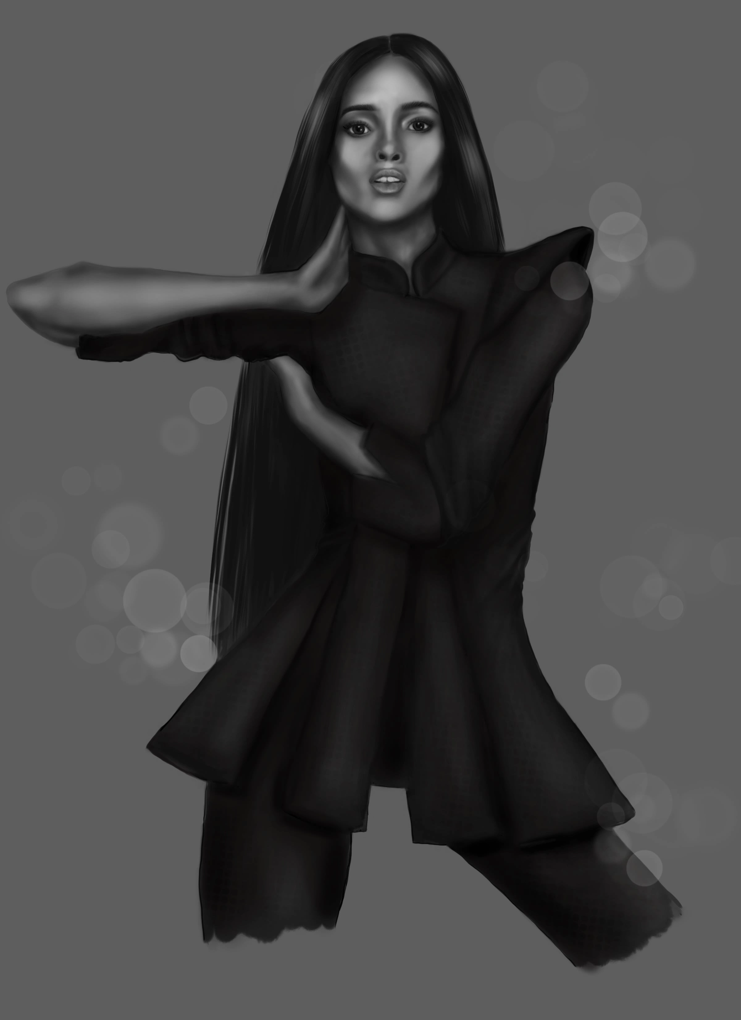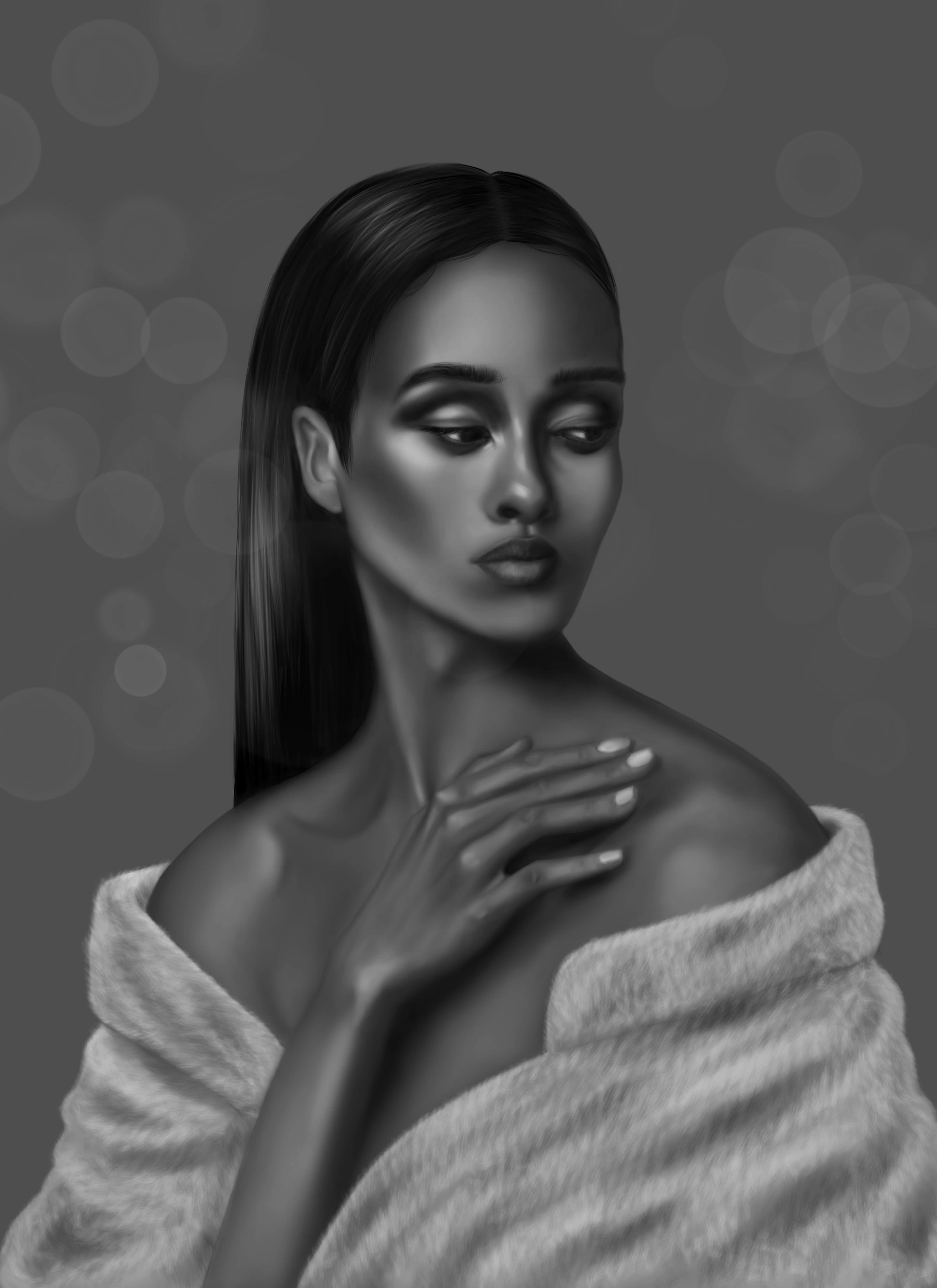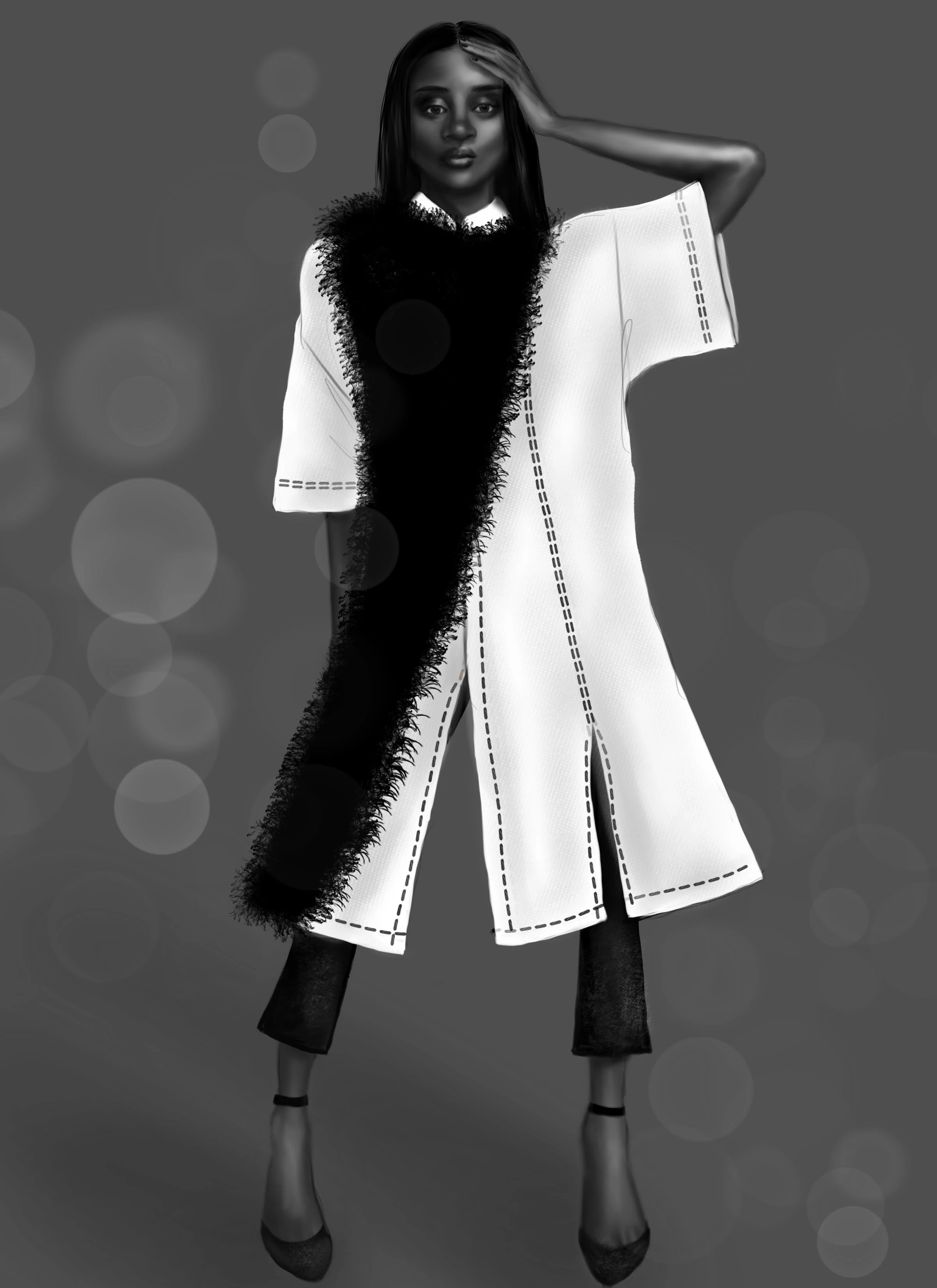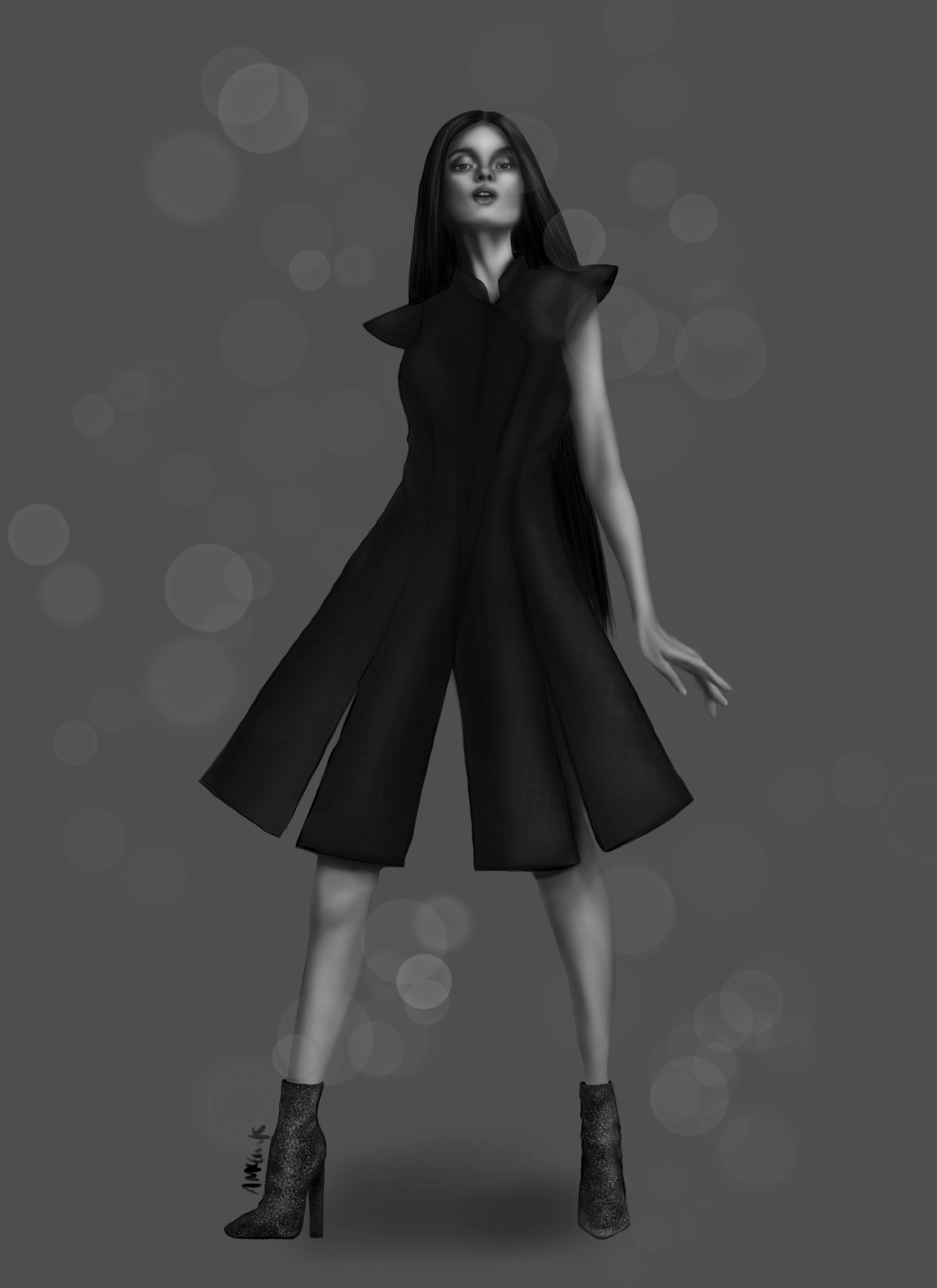 Explore the fusion of black and white portraiture with digital fashion illustrations—a captivating blend of timeless elegance and contemporary artistry.