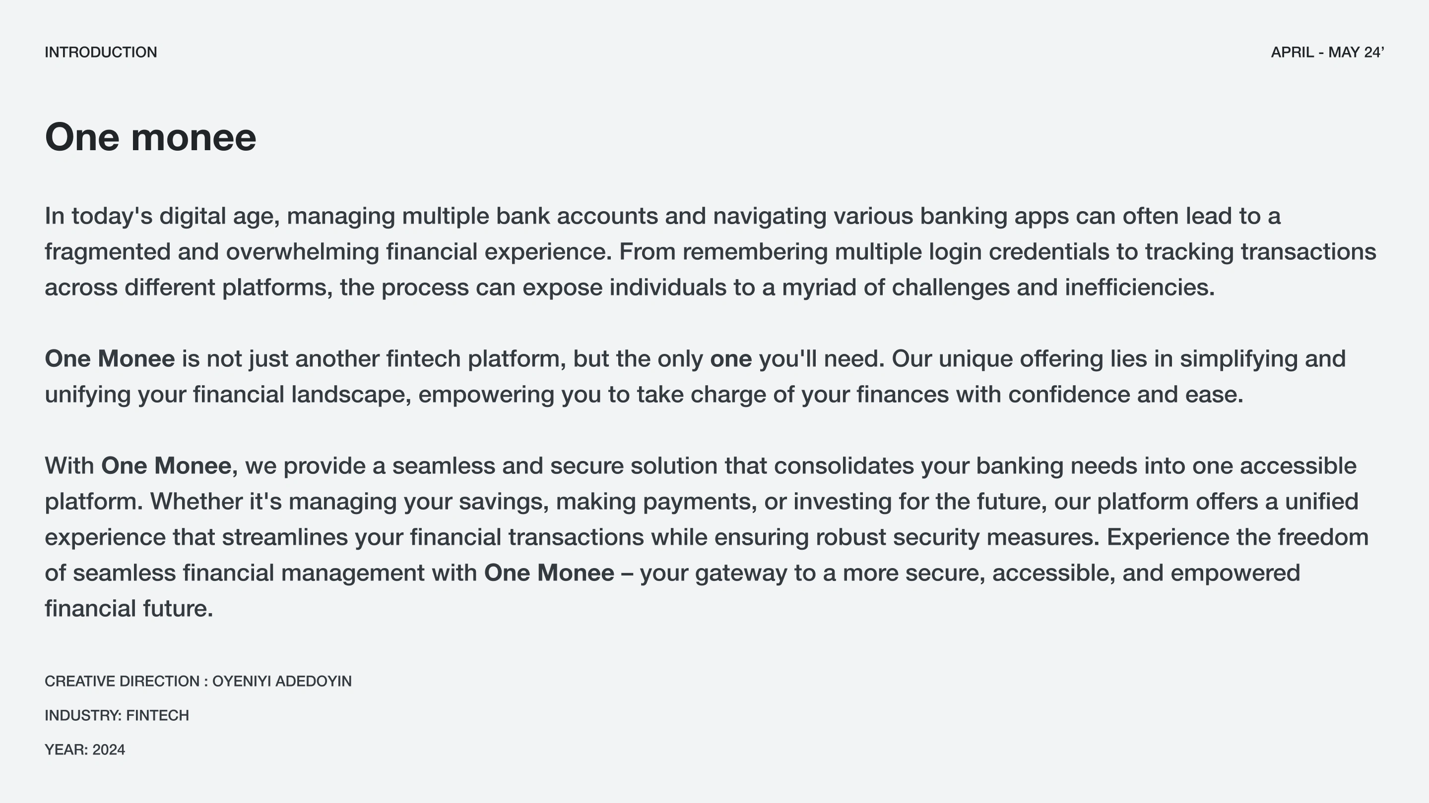 Introducing One Monee, a forward-thinking fintech startup revolutionizing the digital payments landscape. This project encapsulates our mission: to empower ind…