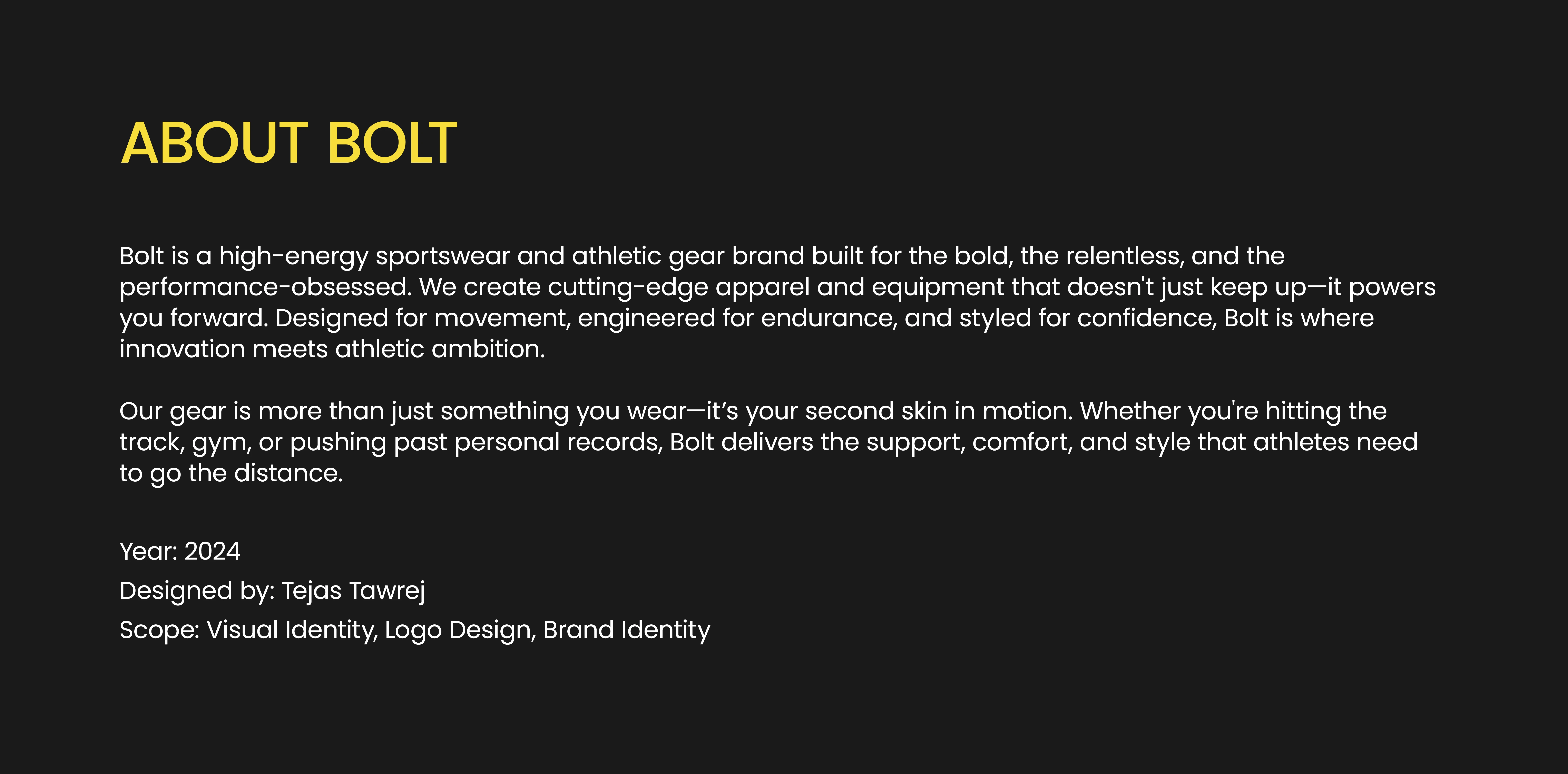 Bolt is a high-energy sportswear and athletic gear brand designed for performance-driven individuals. To match their bold vision and empower athletes with a stronger presence, I designed a new logo and a complete brand identity. The refreshed visual system captures the brand’s dynamic spirit, blending power, speed, and modern style to energize both new and loyal customers.