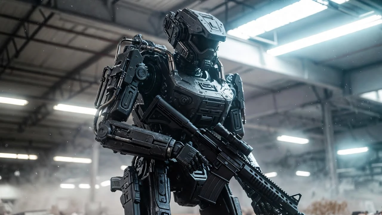 Close-range shot designed to test material realism and light interaction. The metallic surfaces respond naturally to overhead industrial lighting, while micro-details and reflections maintain consistency across the frame, reinforcing a physically grounded presence.