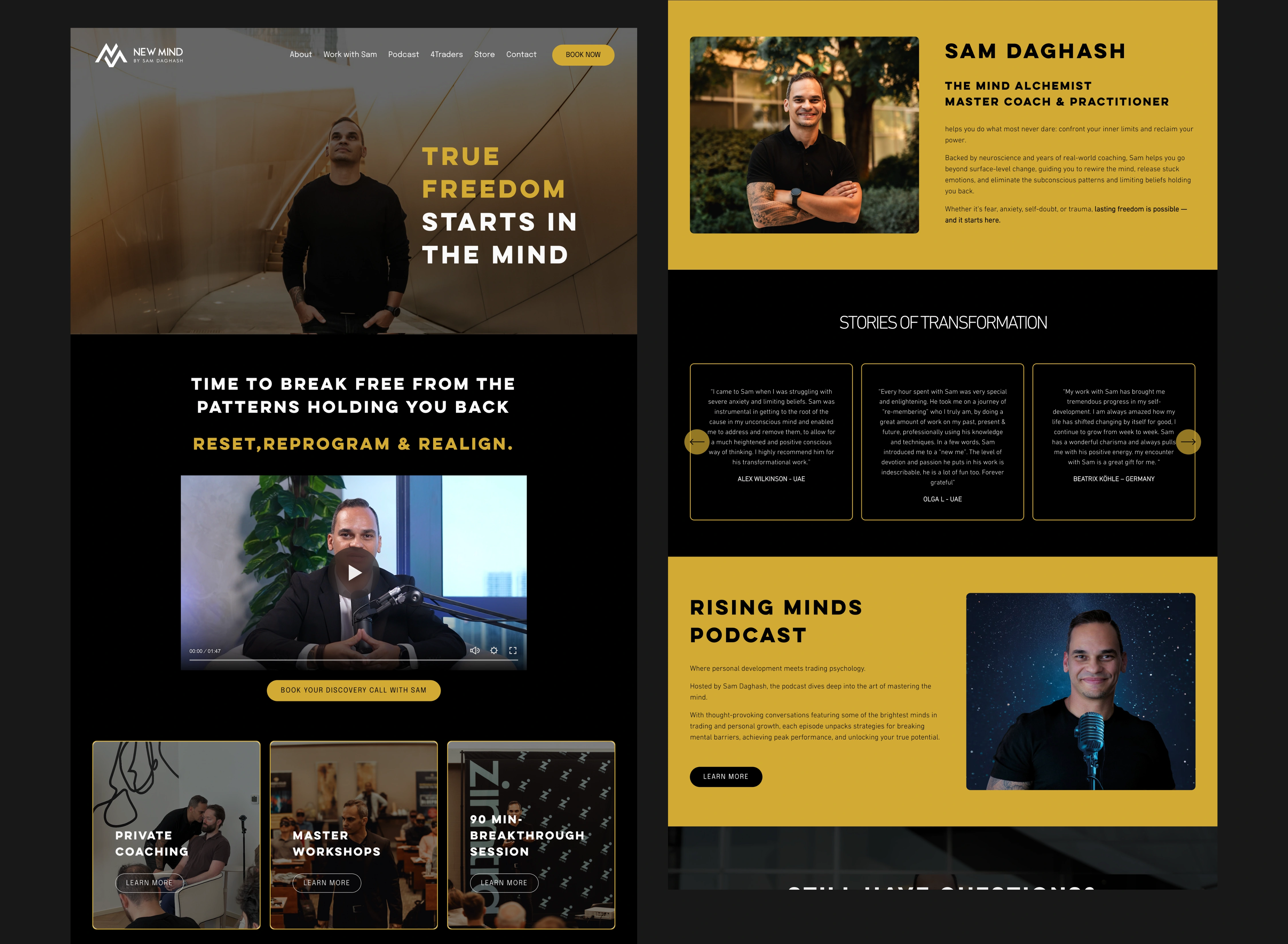 Launched a clean Squarespace site for NEW MIND: +44% discovery calls in month one, 2.0s mobile load, +32% time on page from the podcast block.