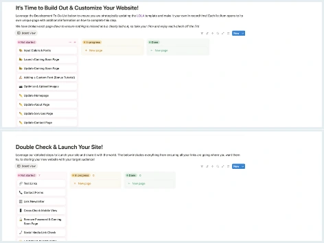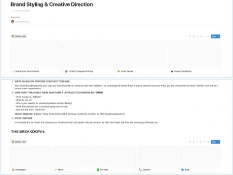 Our templates come with detailed Notion boards that guide you through the personalization process and launch. We include everything from step by step processes to detailed copy development to typography and color palette guidance.