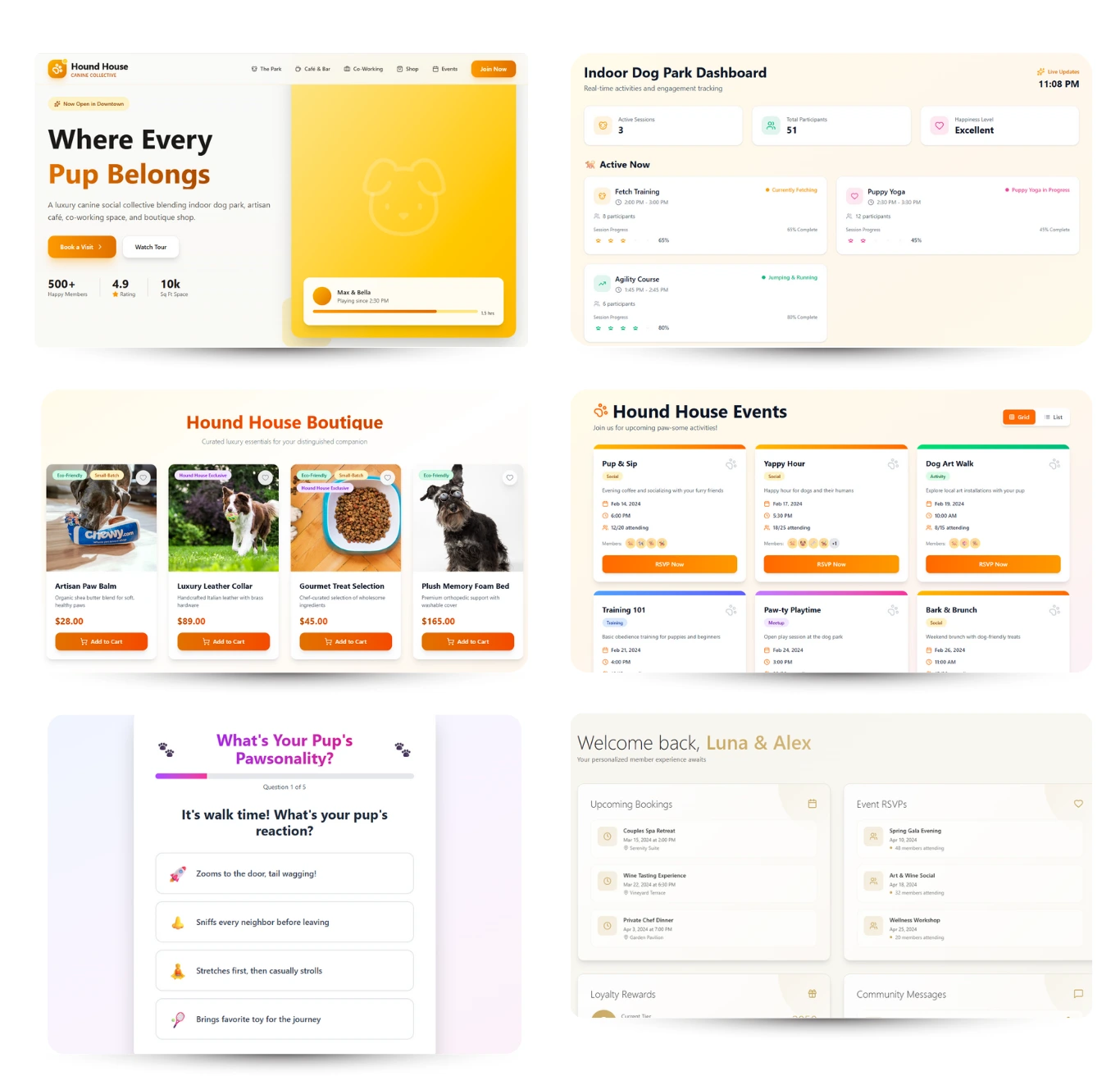 Using MagicPath.ai, I designed a series of interactive UI components that blended hospitality design with lifestyle tech. The system included features like an onboarding flow for members and pups, a co-working booking dashboard, dog park activity tracker, and a dual-profile system for owners and their pets. The interface used natural textures, gold accents, and soft gradients to balance sophistication and warmth.