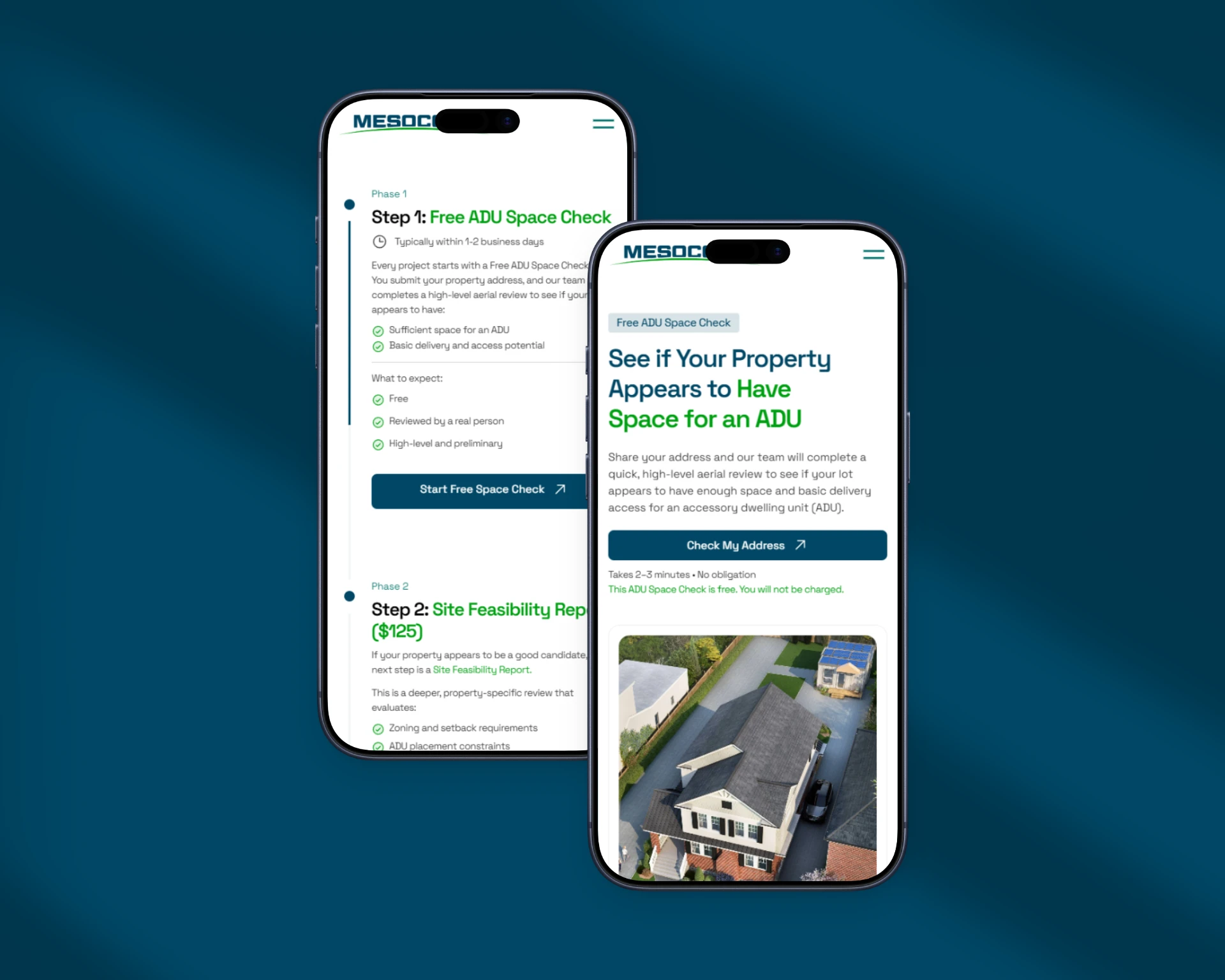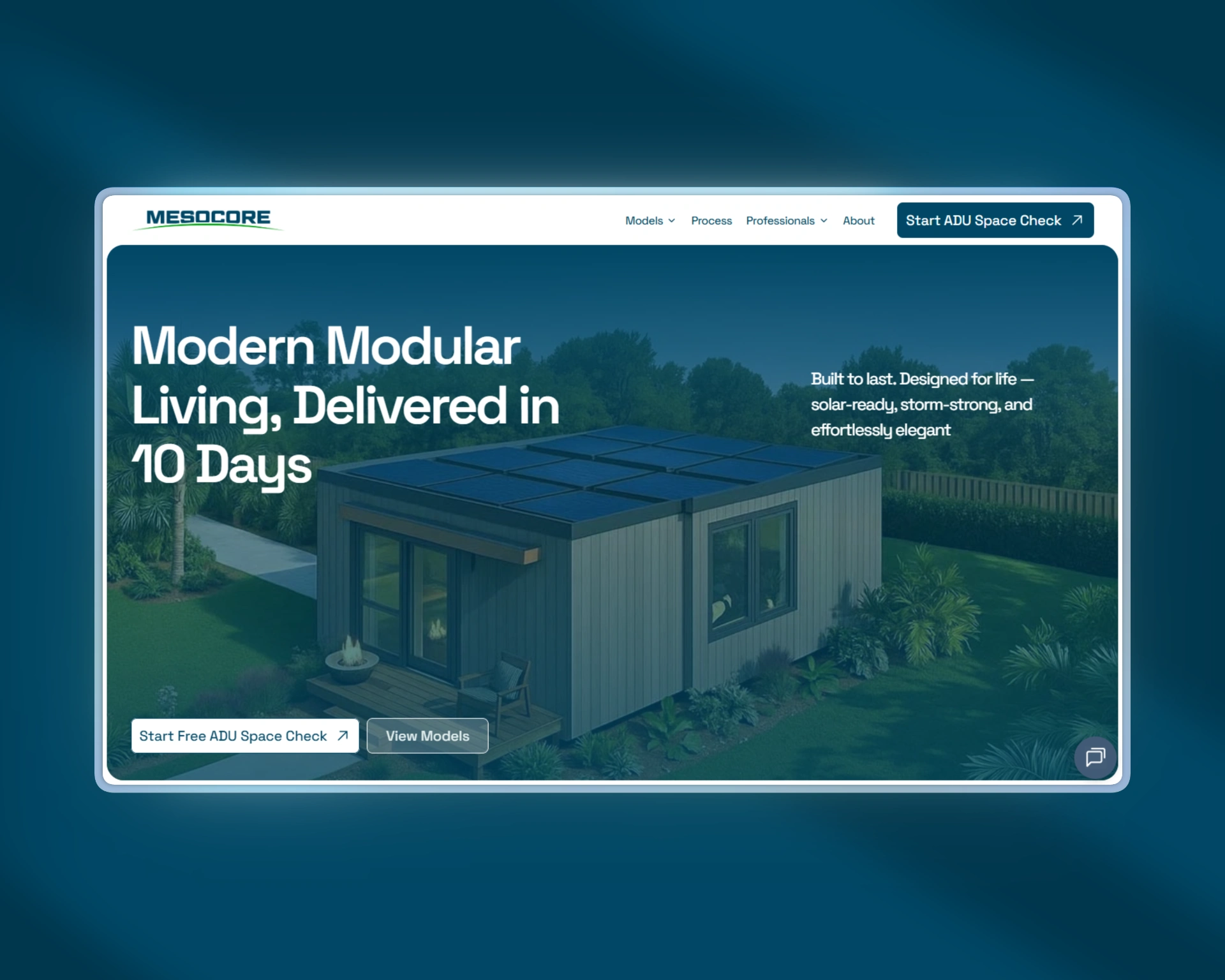 Mesocore is a modular housing and ADU company offering a high-consideration product that requires education, trust, and clear guidance before a user takes action. I was brought in across multiple phases to improve not just the visual design of the website, but its underlying conversion logic — how users moved through the site, how the offer was explained, and how traffic was channeled into qualification and lead-generation flows.