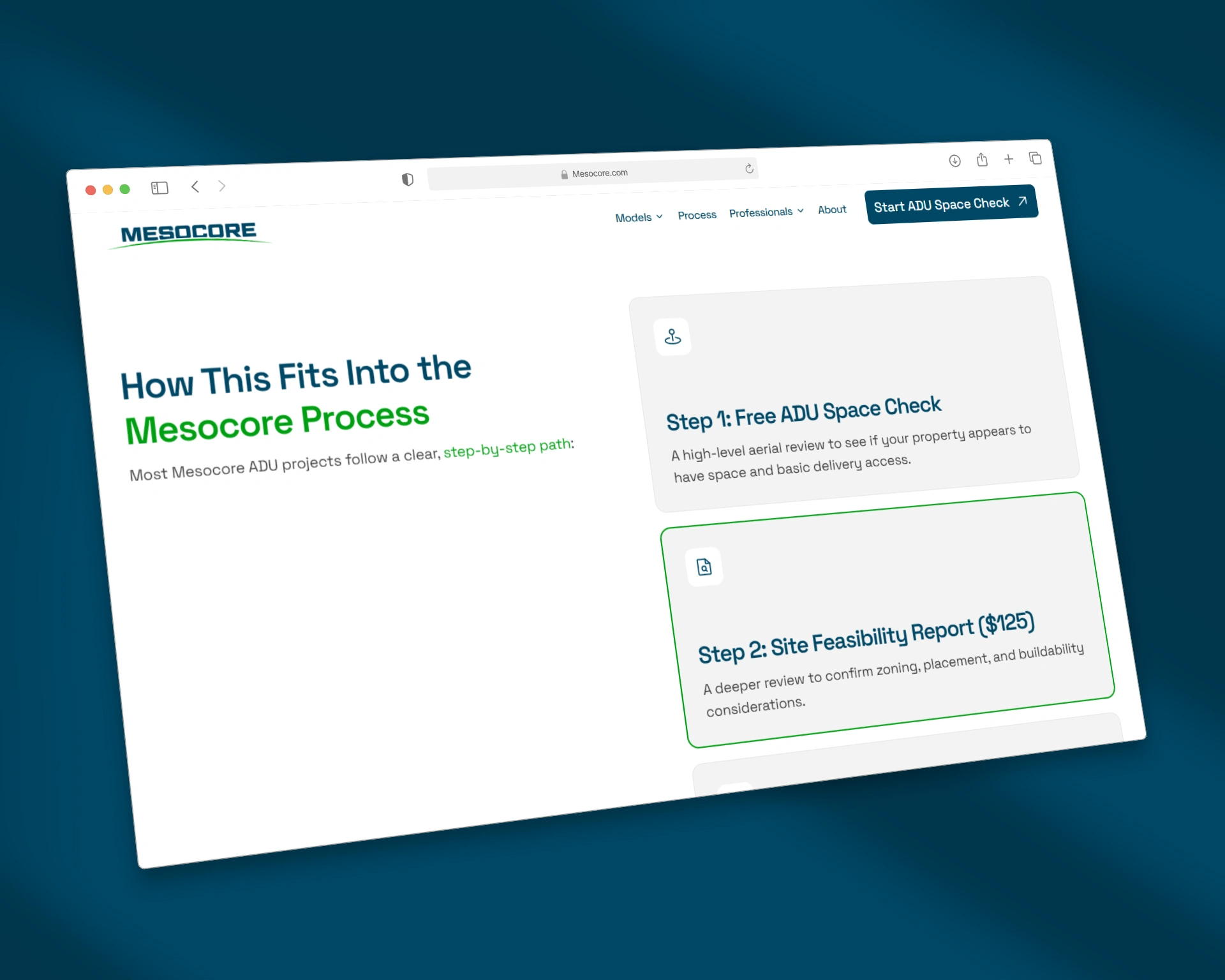Funnel clarity: I clarified the distinction between the free ADU Space Check and the paid Site Feasibility Report, reducing ambiguity in the qualification journey and lowering decision friction at key drop-off points.
