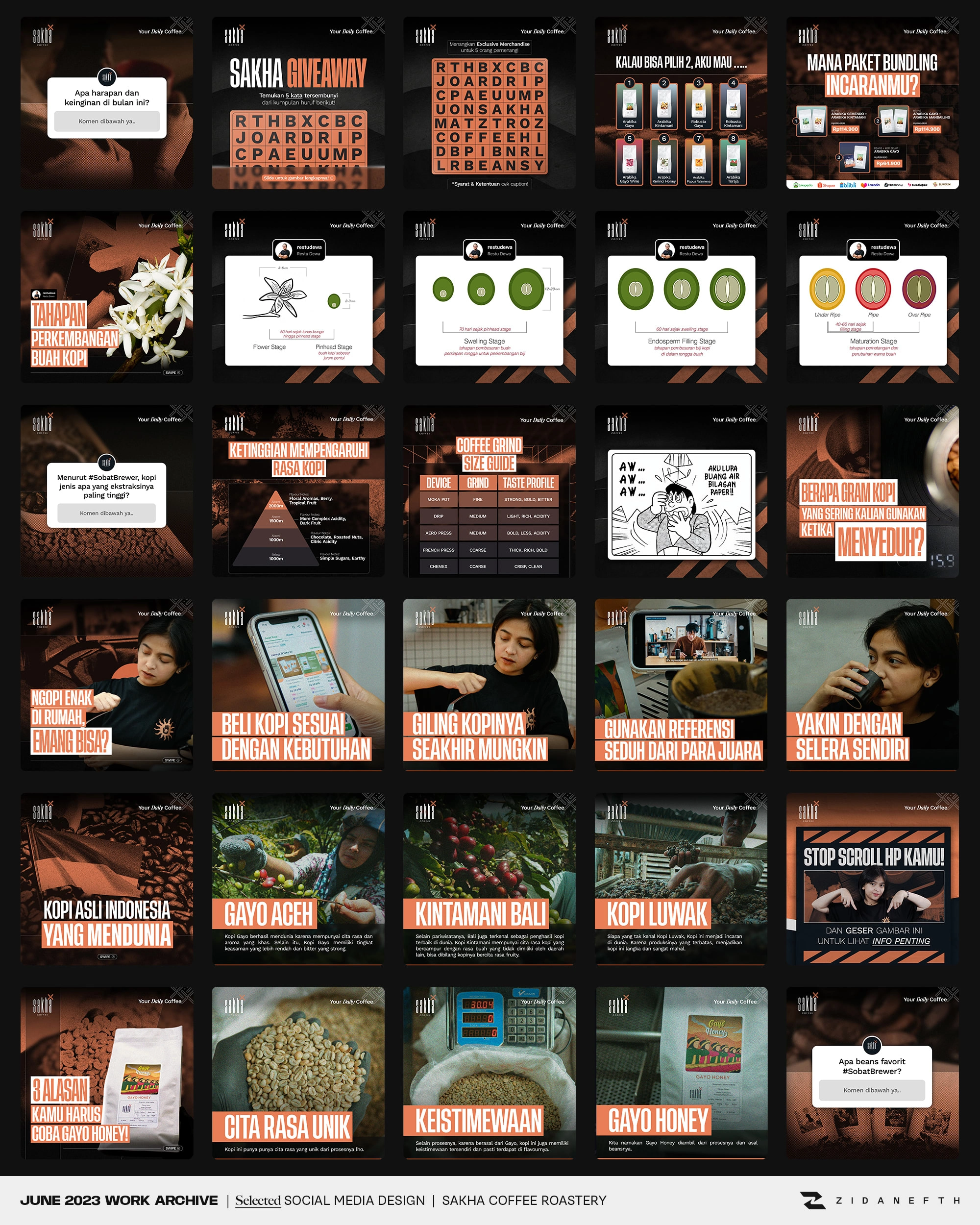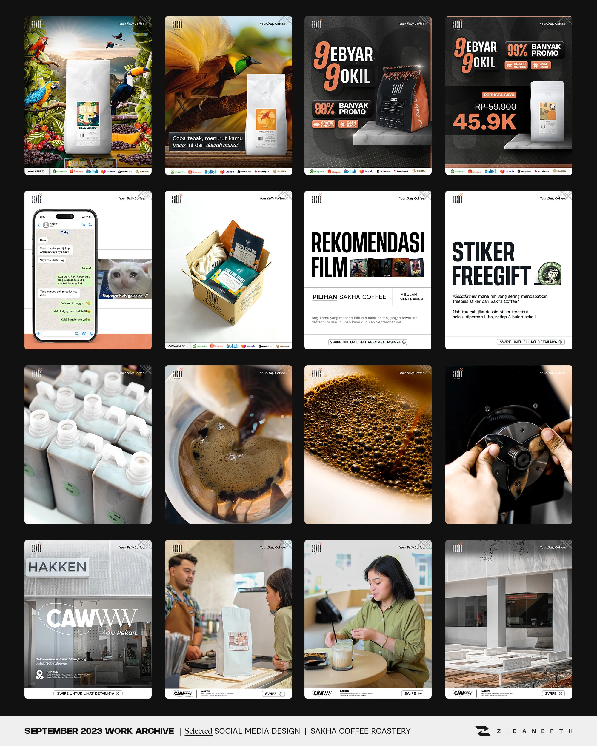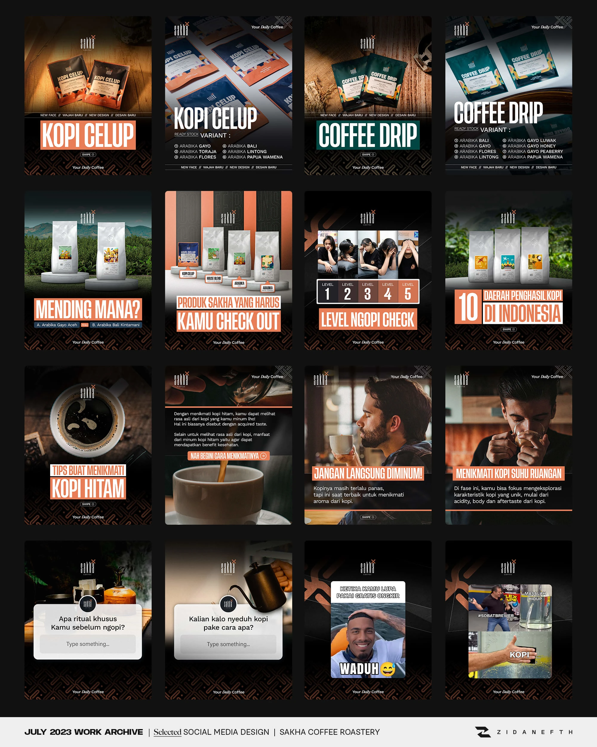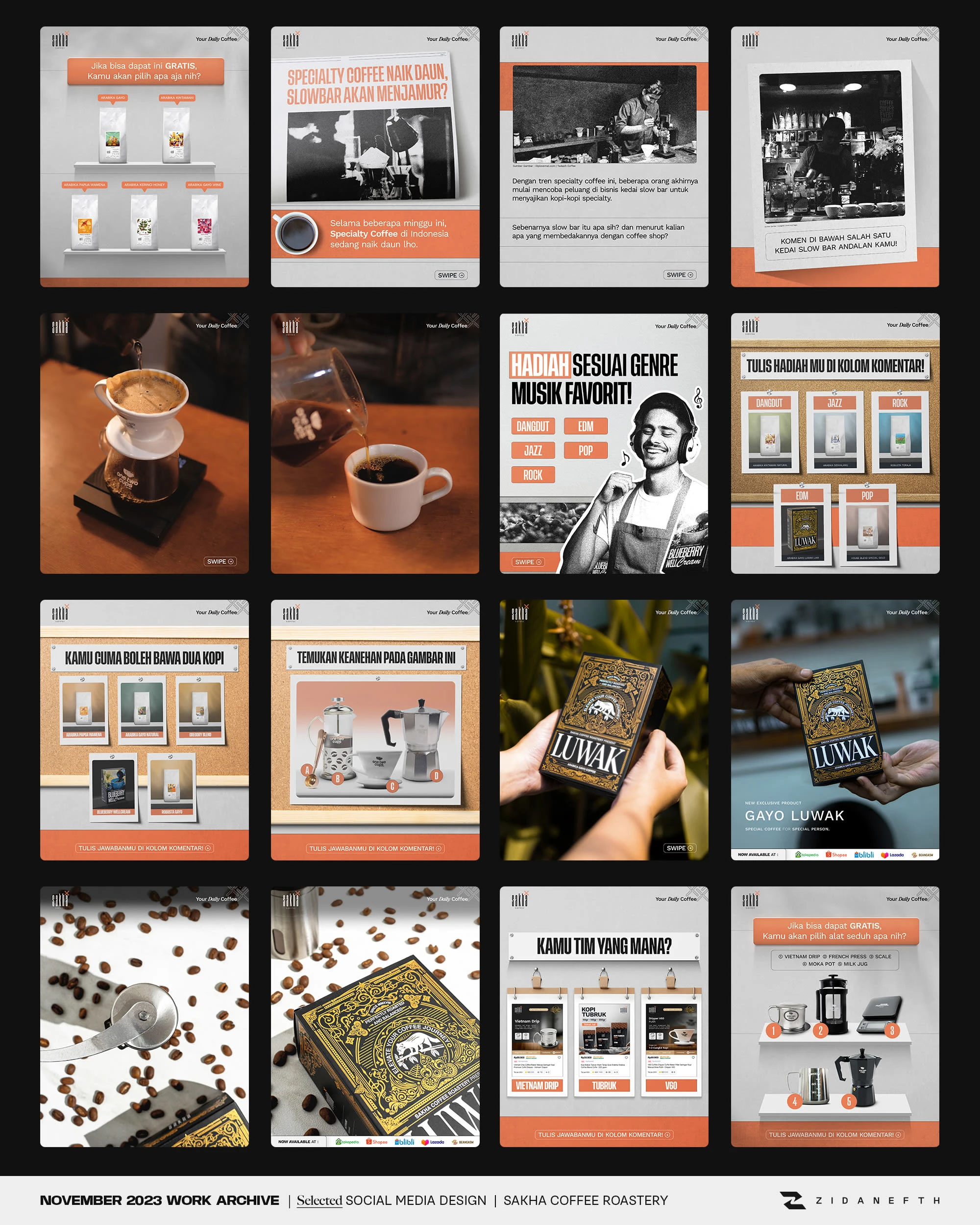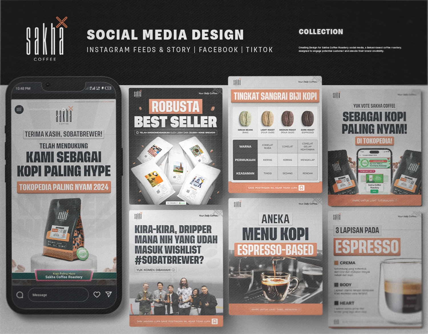 Crafted engaging social media content for Sakha Coffee. Designed Instagram feeds and TikTok layouts to boost audience interaction and elevate F&B branding.