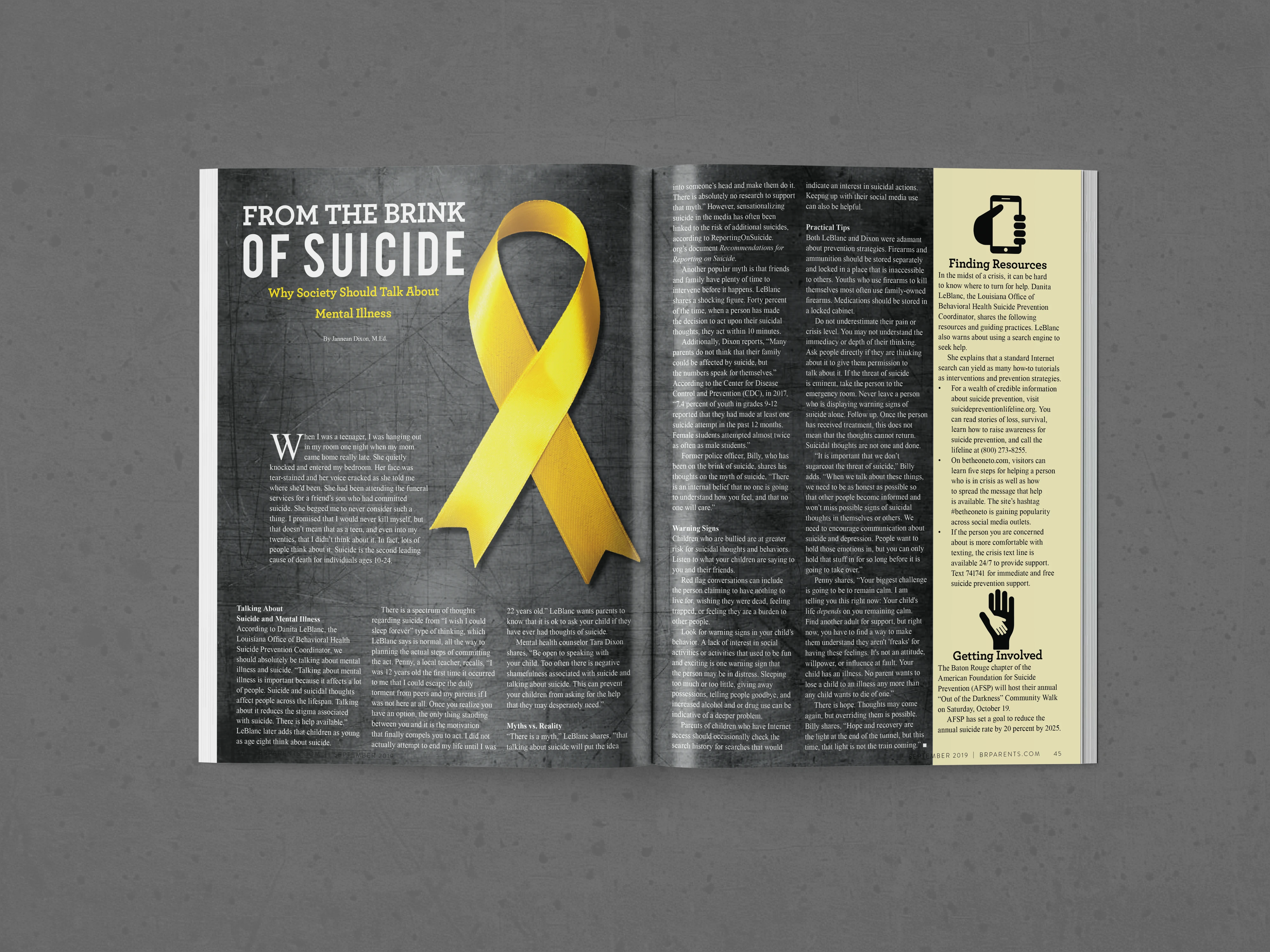 As a part-time student employee at Baton Rouge Parents Magazine (December 2018 - December 2019), I contributed to the publication's layout and design. While adhering to established templates was typical, certain spreads offered opportunities for greater creative expression. This feature on suicide and mental health awareness was one such project where we aimed to create a visually impactful design.