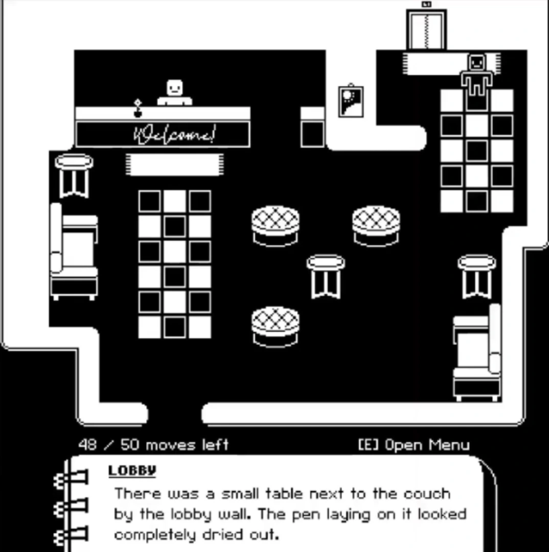 Strategic Visual Design: Black-and-white aesthetic with red highlights for important info. Pop-up indicators in early levels, then independent exploration. Killer entry notifications gave players agency to keep searching or move on.