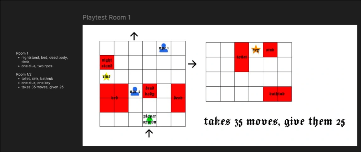 I created initial map designs in Figma using a grid-based template with a symbol key (red for obstacles, blue for NPCs, green for player, stars for clues). Started with a 6x6 grid, expanded as mechanics solidified. Each level needed to work as both a hotel space and a puzzle where move economy mattered.