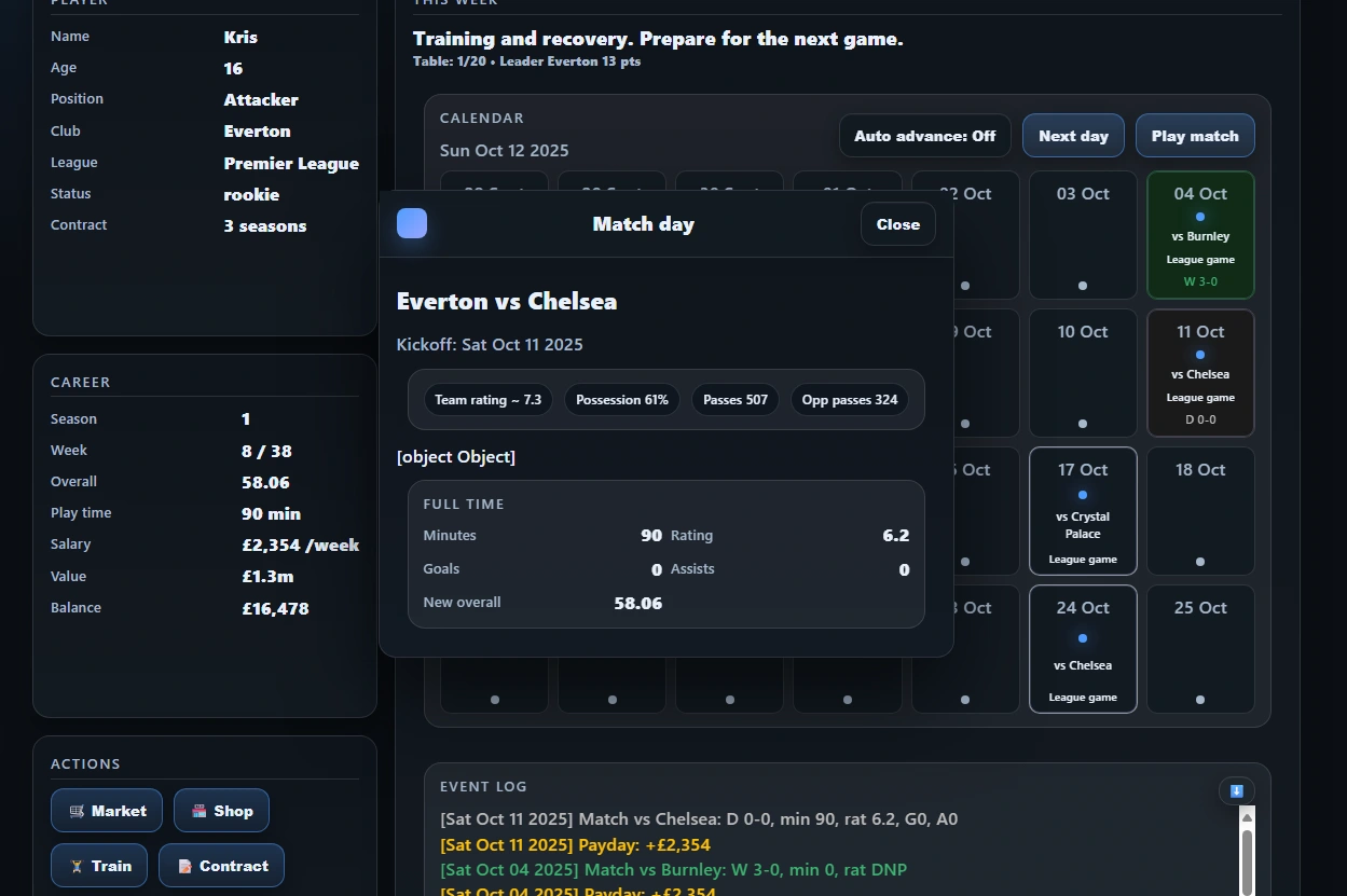 The Bug: Identified a critical flaw, where spamming the 'Next Day' input while 'Auto-Advance' was active caused the game loop to accelerate exponentially, skipping weeks in seconds.