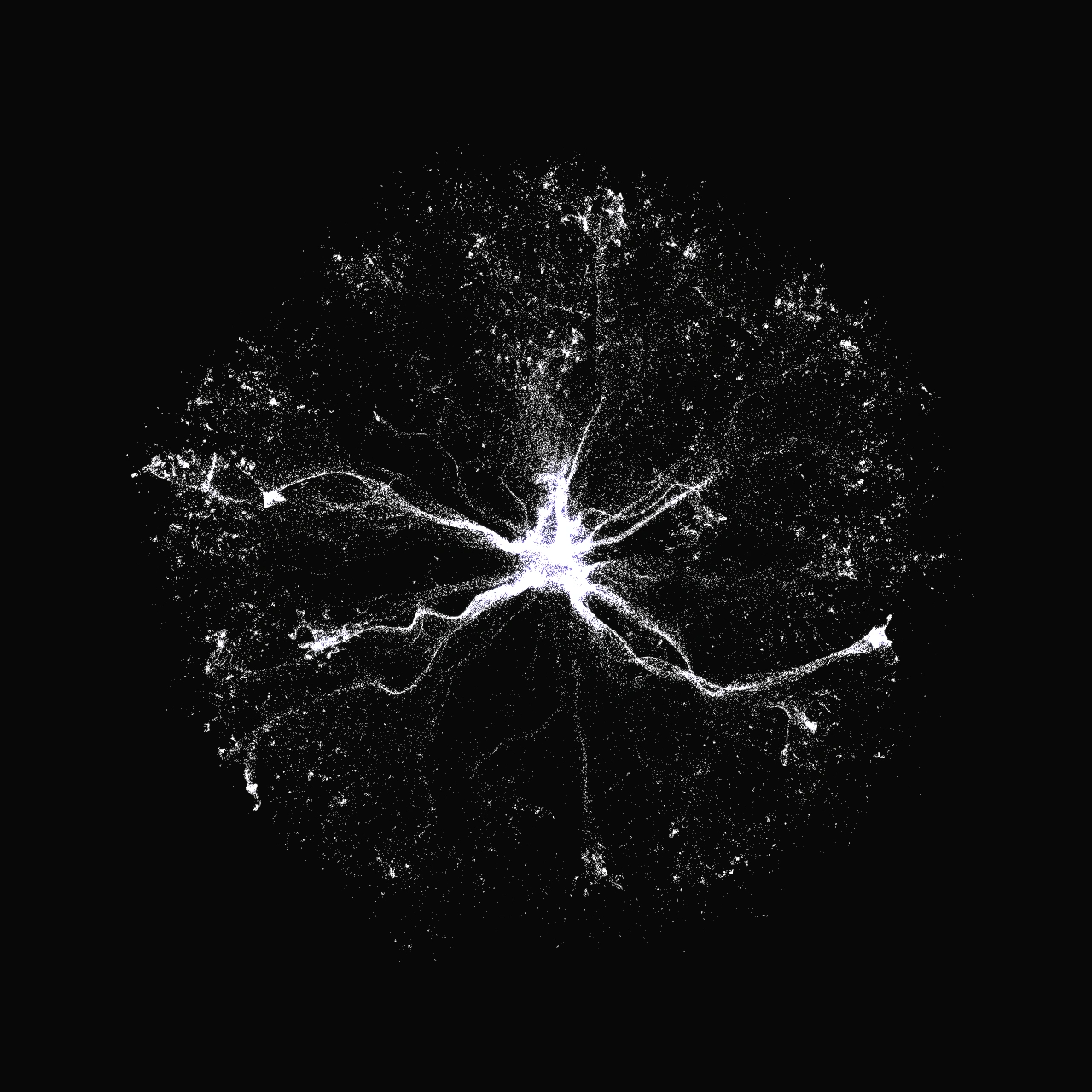The track tells a story of inception, of energy being born and rippling outward, so the visual had to do the same. I wanted something that felt alive, not static. Something that looked like it was in the process of becoming. The idea landed on a nervous-system-like structure emerging from a single point of light, all tendrils and scattered particles radiating into the void. Cosmic, organic, raw.