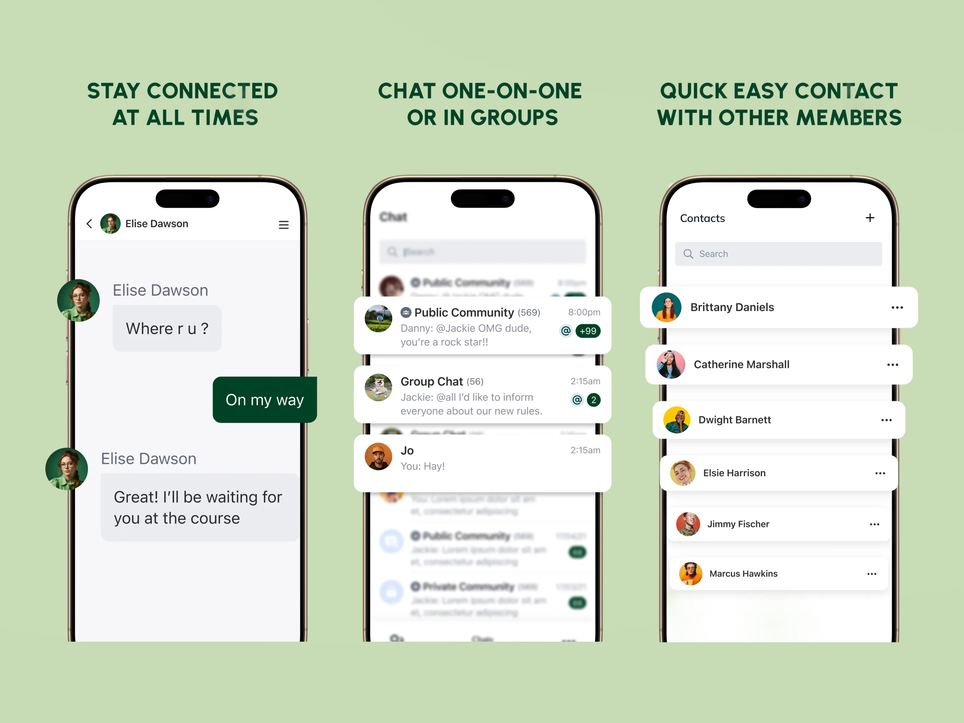 Create a seamless chat experience that supports one-on-one messaging, group coordination, and quick access to club members — optimized for mobile use on- and off-course.
