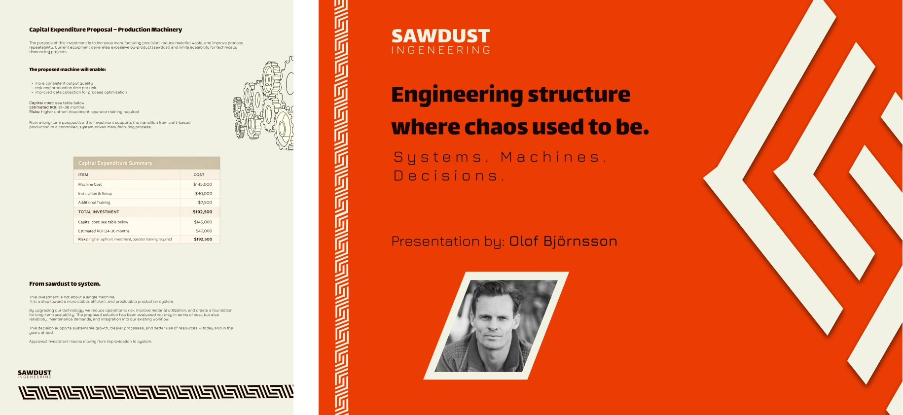 Visual identity for an engineering studio focused on system-driven wood production, including logo design and internal brand materials.