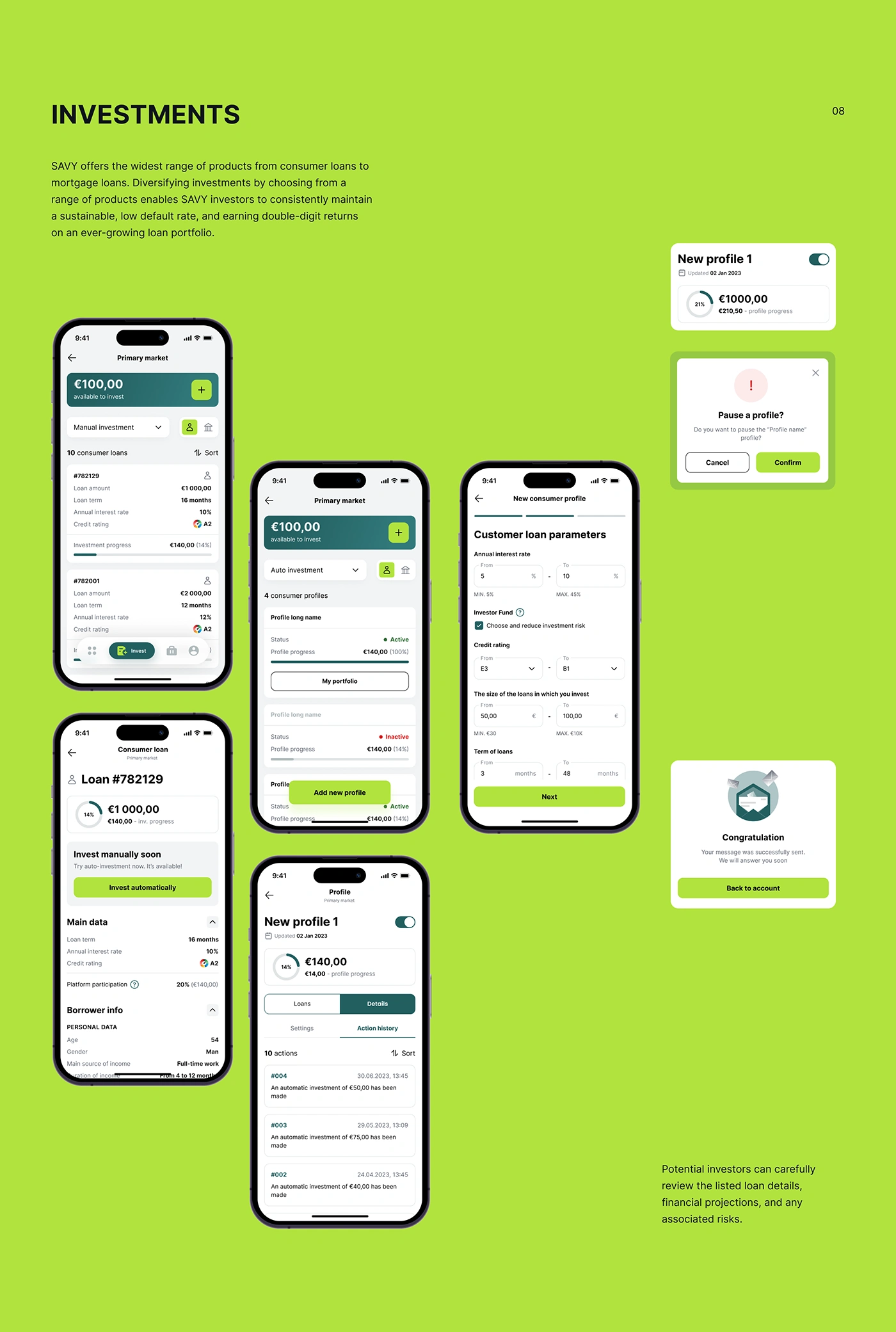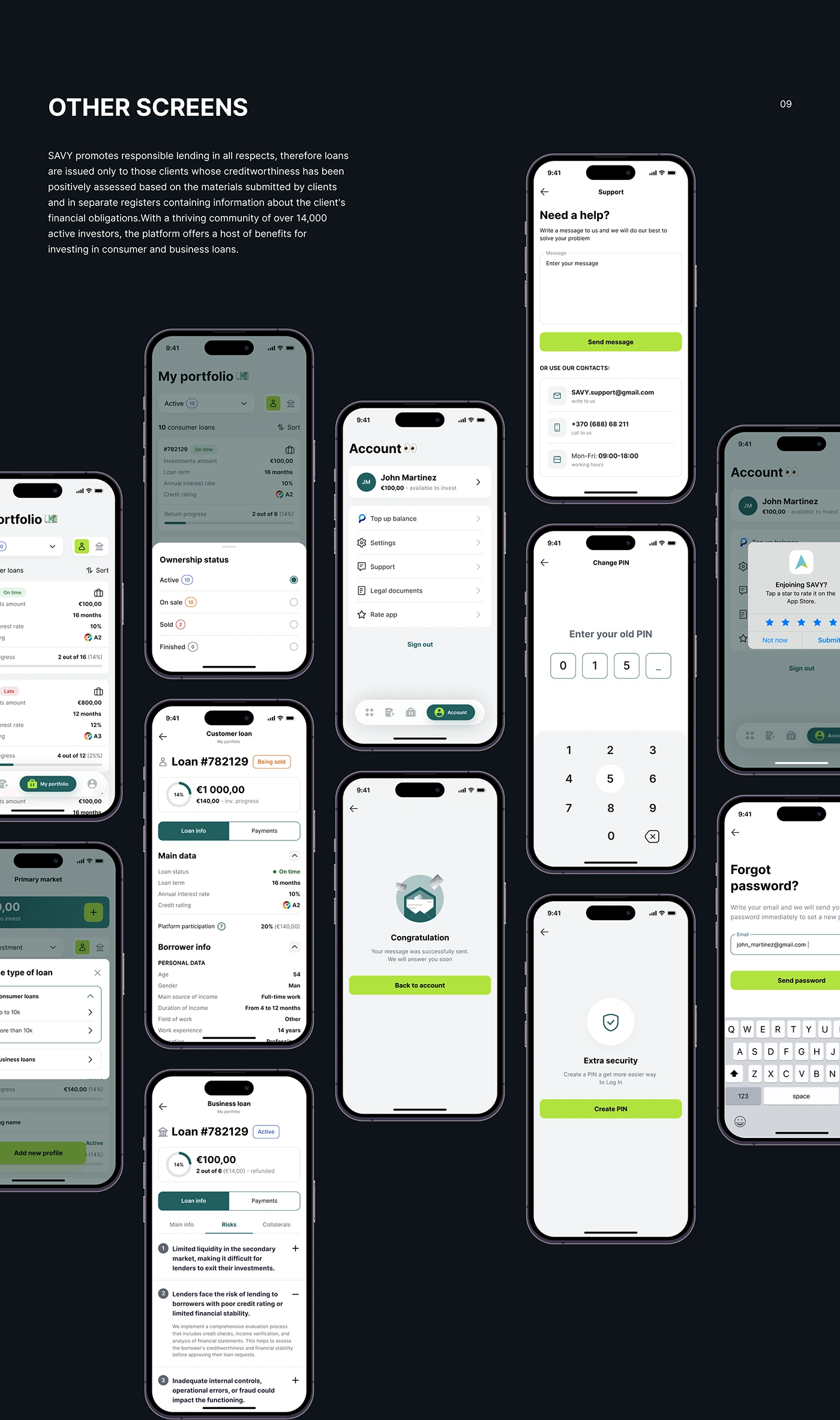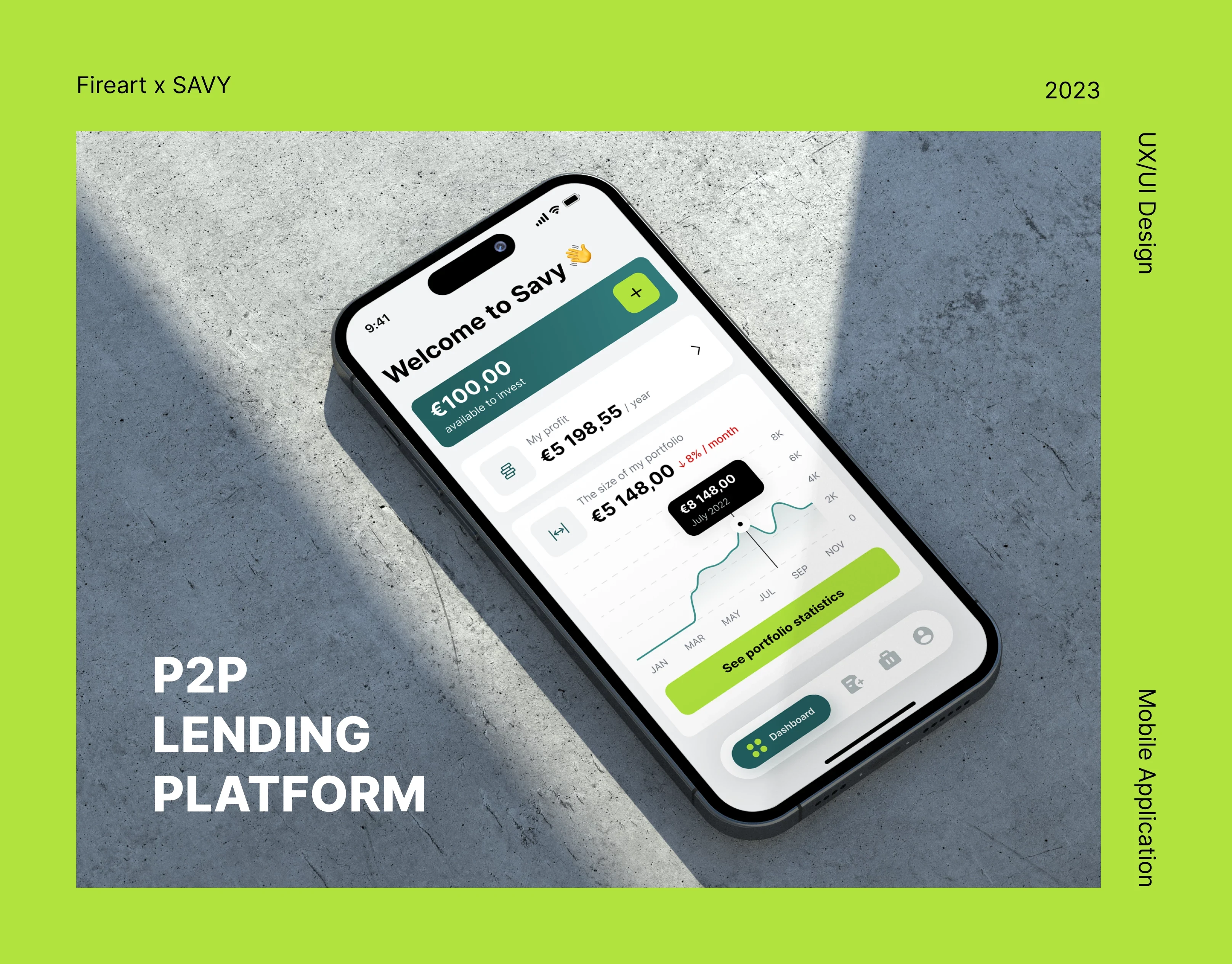 Mobile app design for SAVY, a peer-to-peer lending platform that connects investors and borrowers through a simple, transparent financial experience.