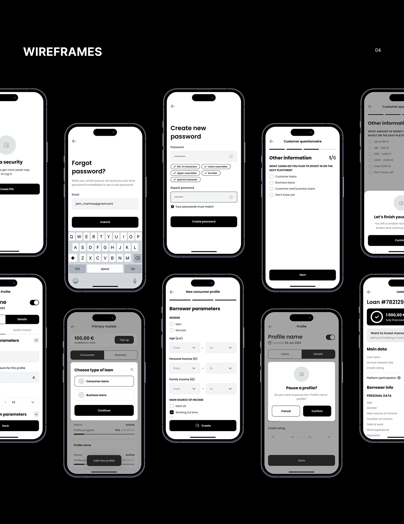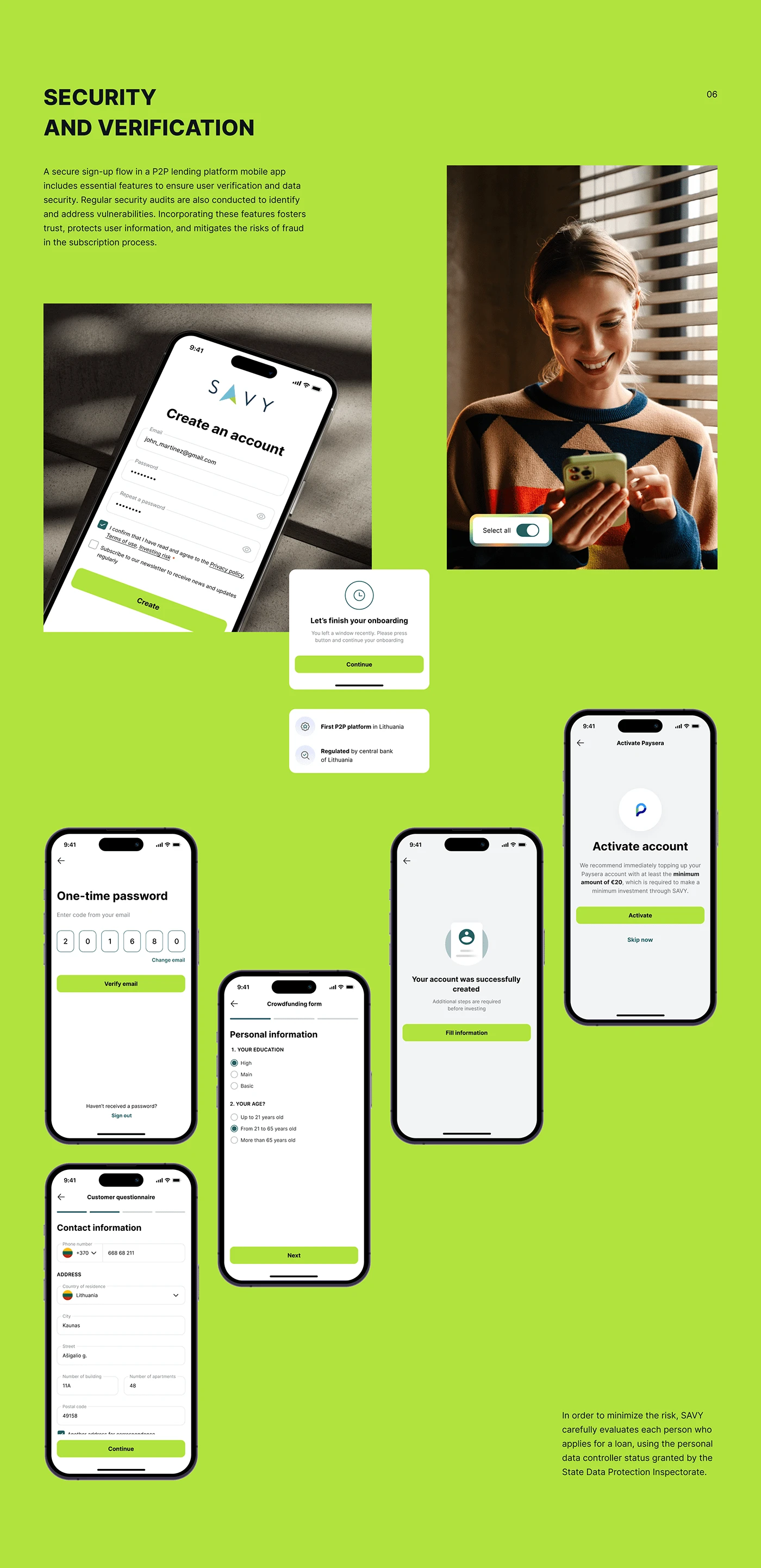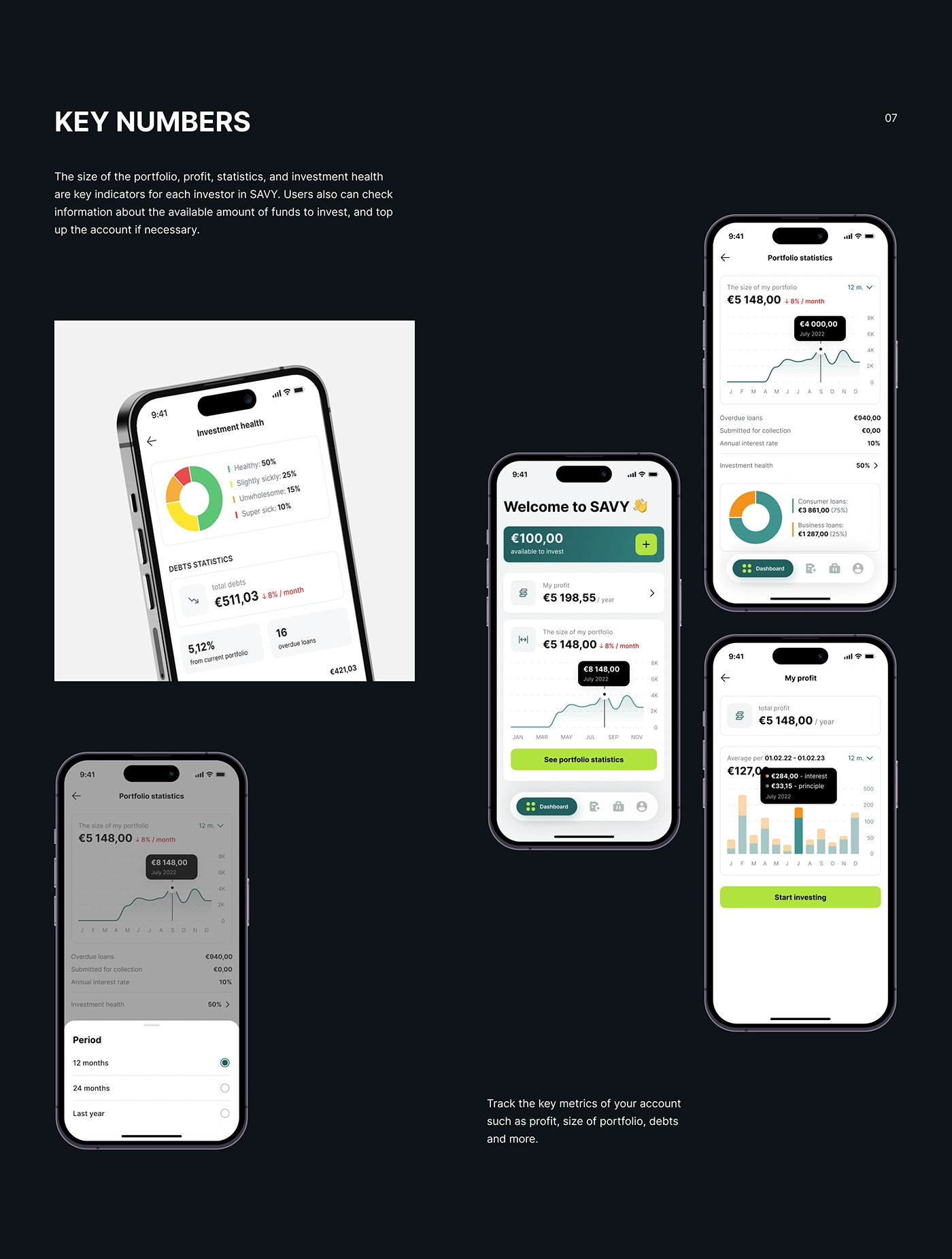 Mobile app design for SAVY, a peer-to-peer lending platform that connects investors and borrowers through a simple, transparent financial experience.