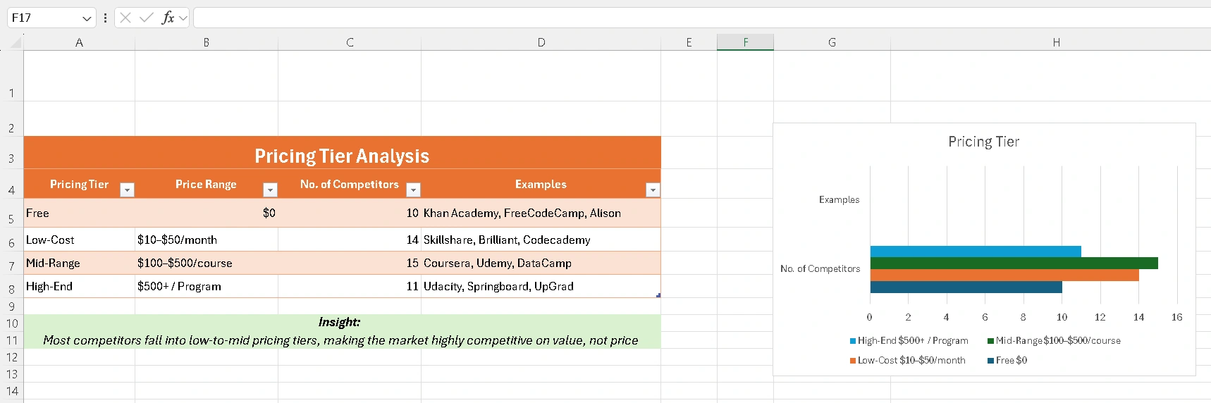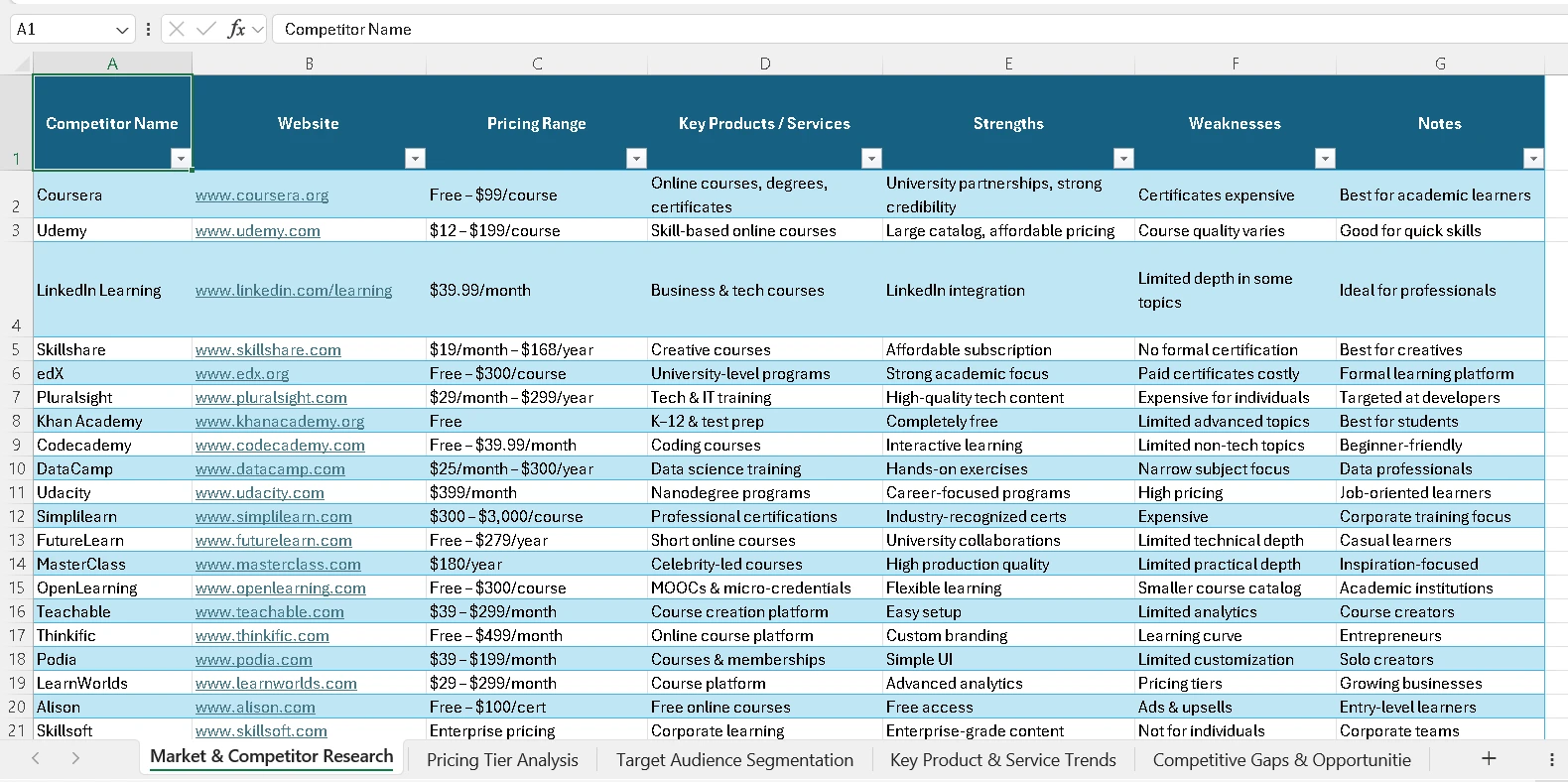Conducted structured competitor research for an e-learning platform and delivered actionable market insights through a clean, analysis-ready Excel workbook.