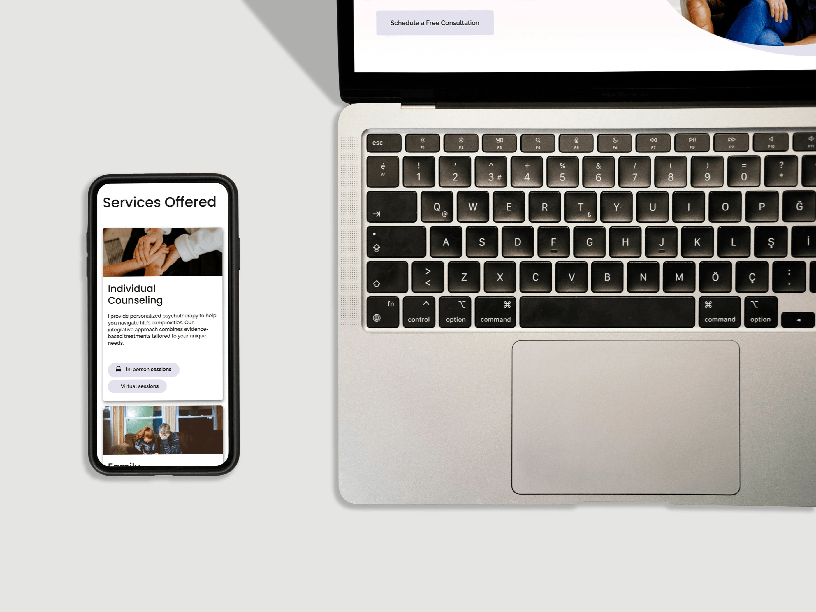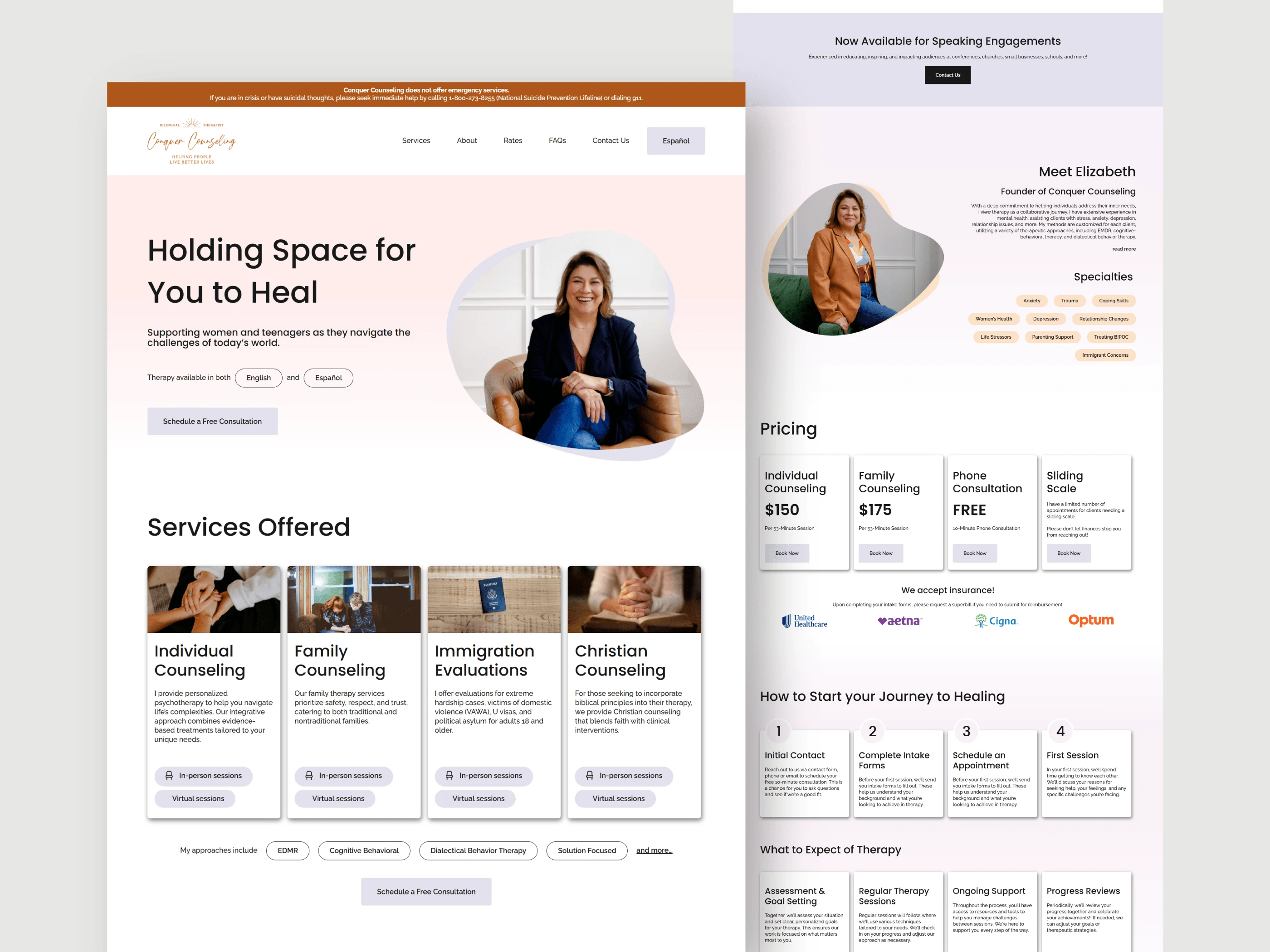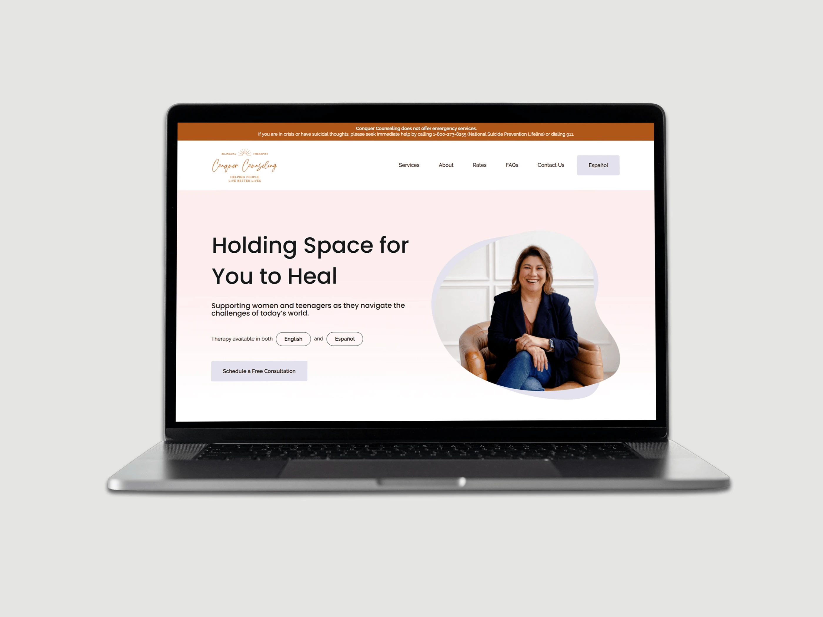 Redesigned Conquer Counselling's website, upgrading a DIY Squarespace site to a strategic, user-friendly one-page website with a natural flow of key info.