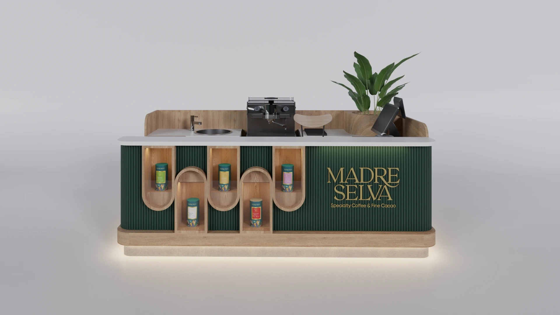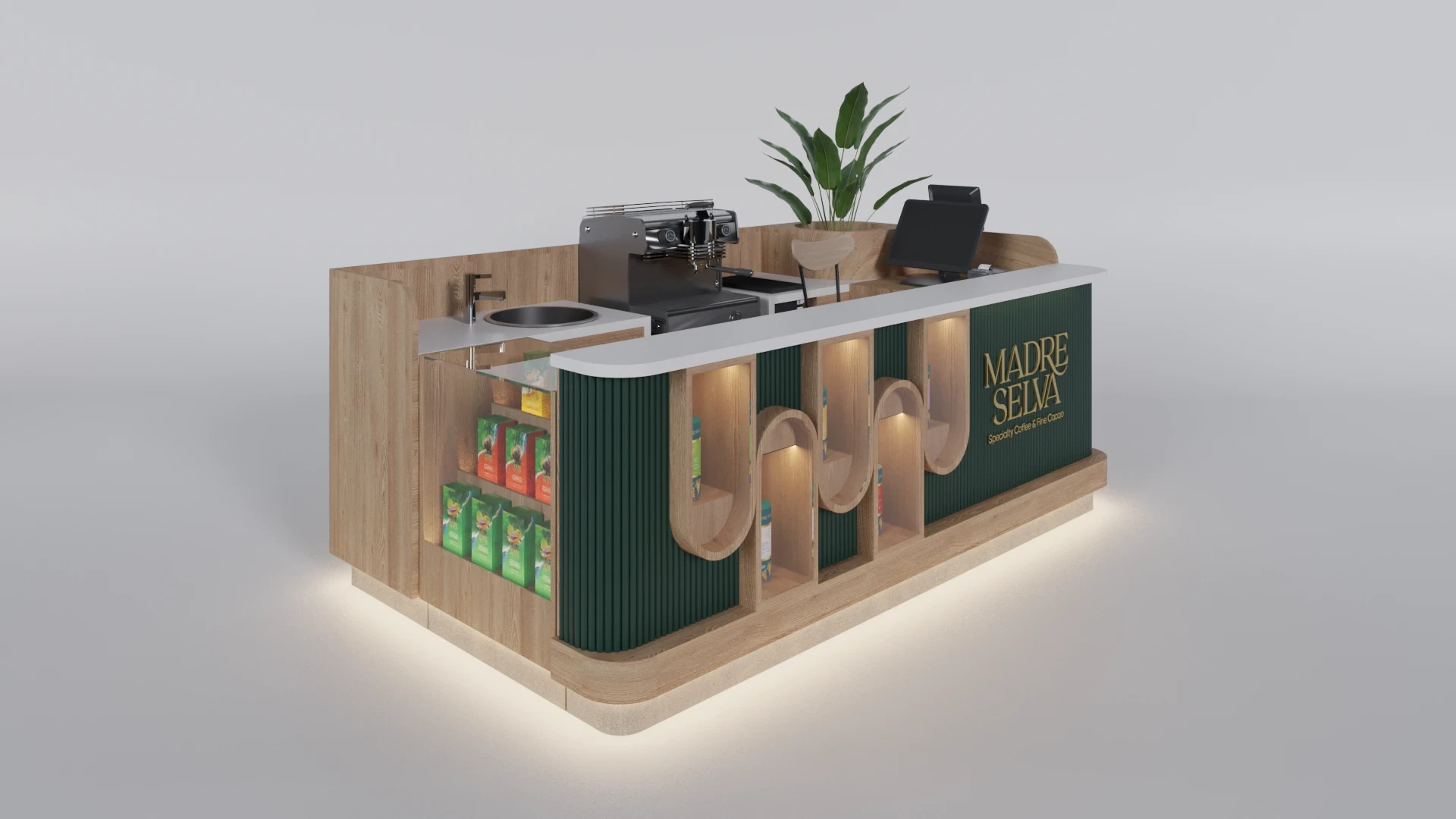MADRE SELVA: A Colombian coffee brand. The kiosk design emphasized warm wood textures and earthy materials to highlight its artisanal roots.