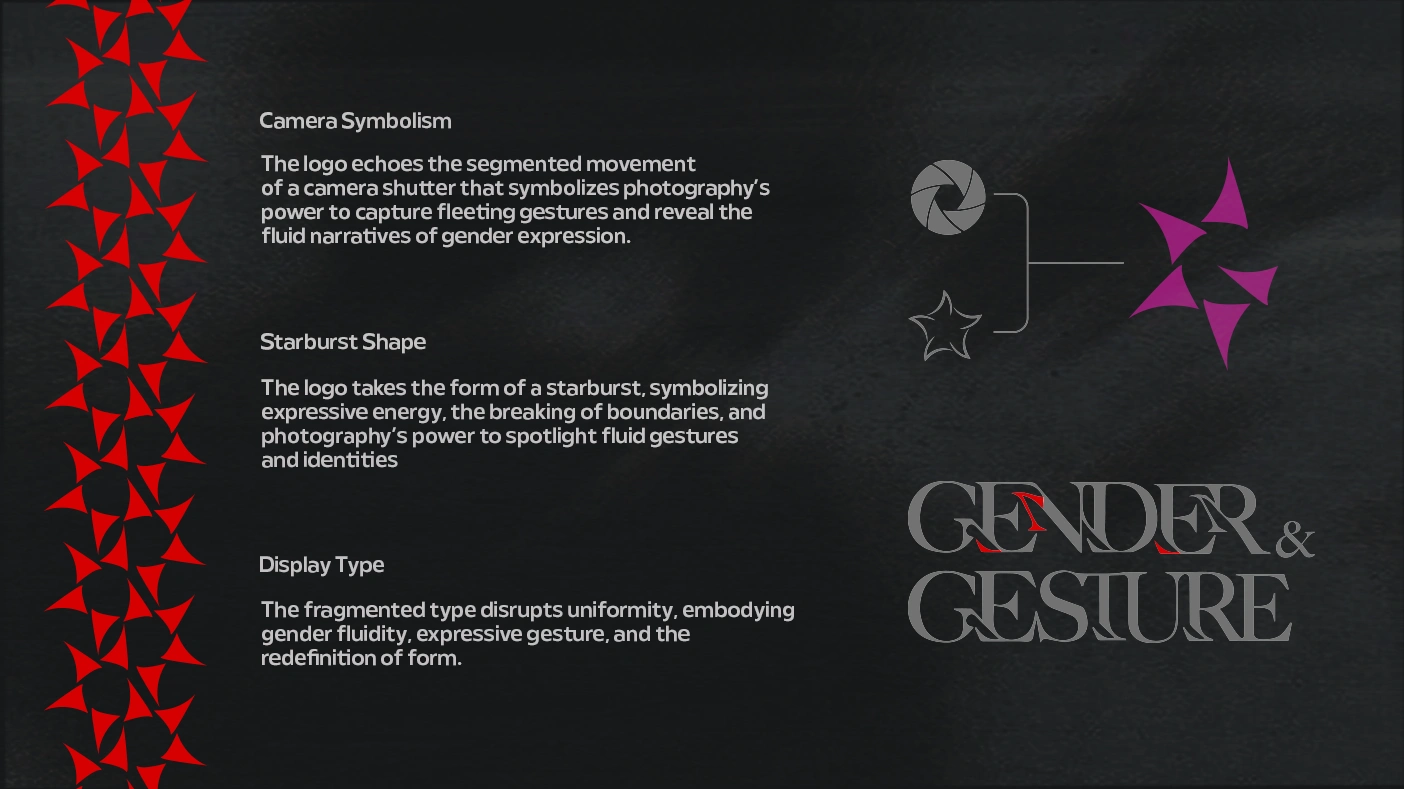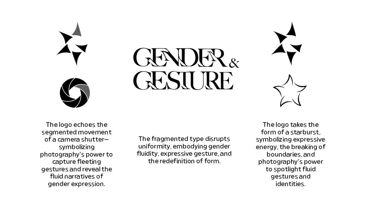 This project focuses on branding for Gender & Gesture, an event centered on identity, expression, and movement. The visual identity was designed to reflect the fluidity and dynamism of gender expression, using bold graphic elements and a strong conceptual foundation. At the heart of the branding is a distinctive logo-a stylized 'G' bursting outward like a star. This form symbolizes transformation, energy, and the breaking of societal boundaries, reinforcing the event's message of inclusivity and self-expression. The typography and supporting visuals further enhance the sense of motion and evolution.