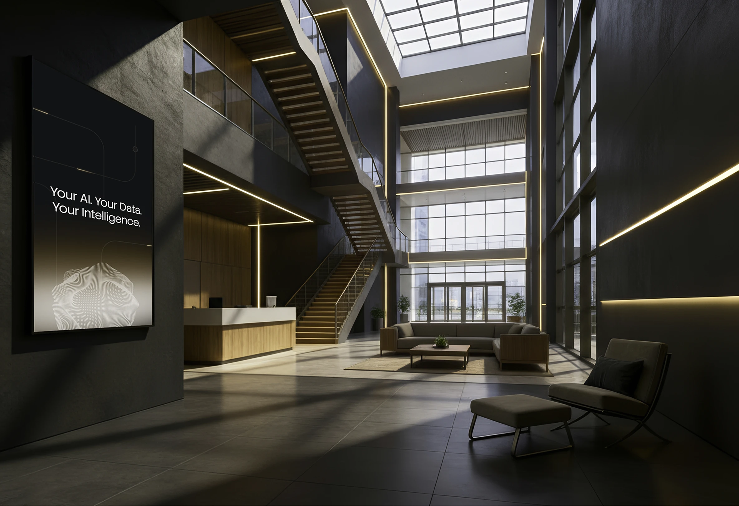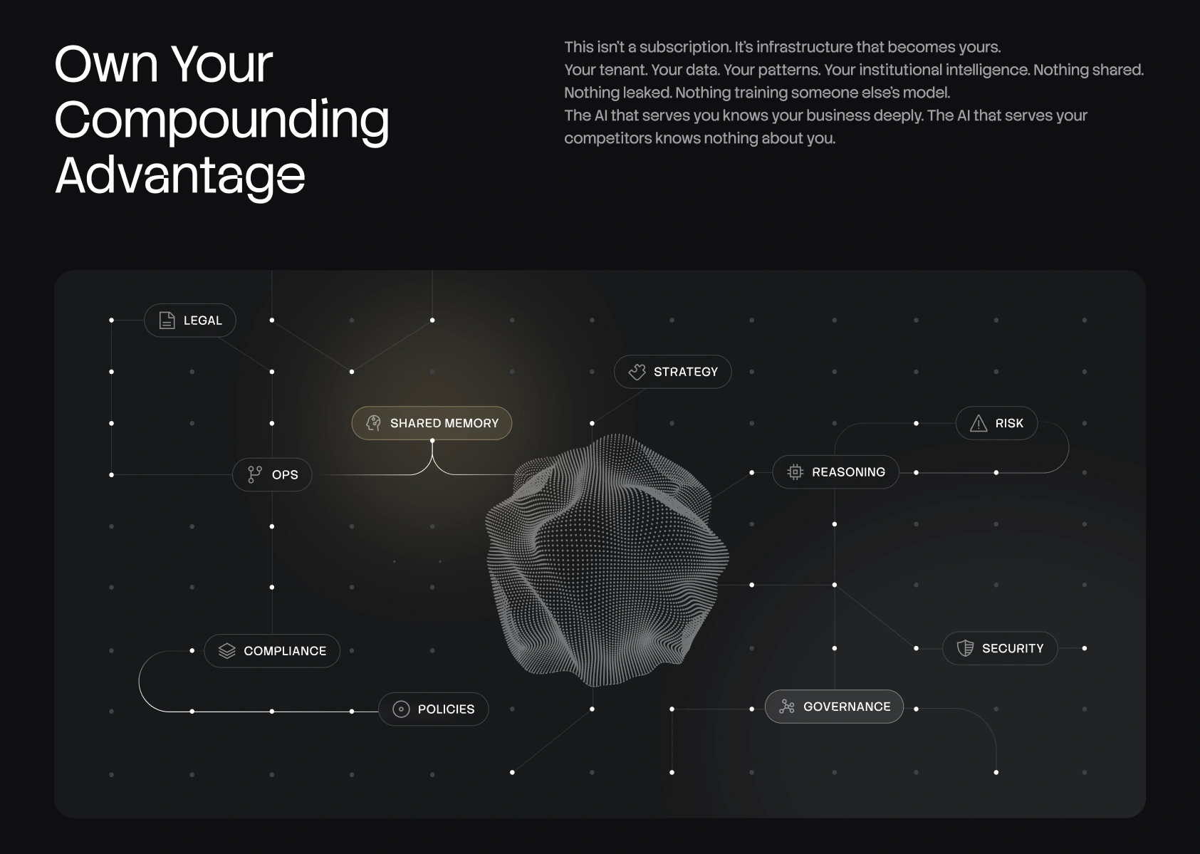 We built a visual system around deep blacks and restrained gold gradients to signal enterprise trust and architectural depth. Motion, glow, and blur were treated as structural elements, representing layered, compounding intelligence.