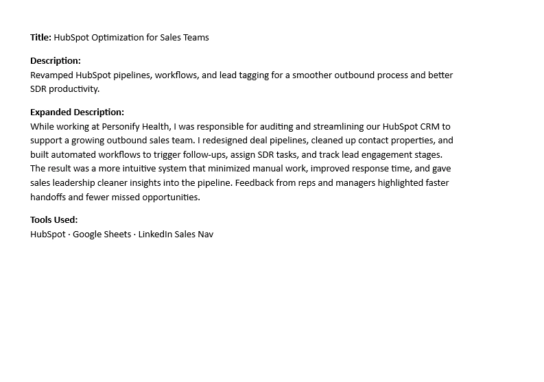 Redesigned HubSpot pipelines and built sales workflows to streamline outreach, reduce manual errors, and boost SDR efficiency.
