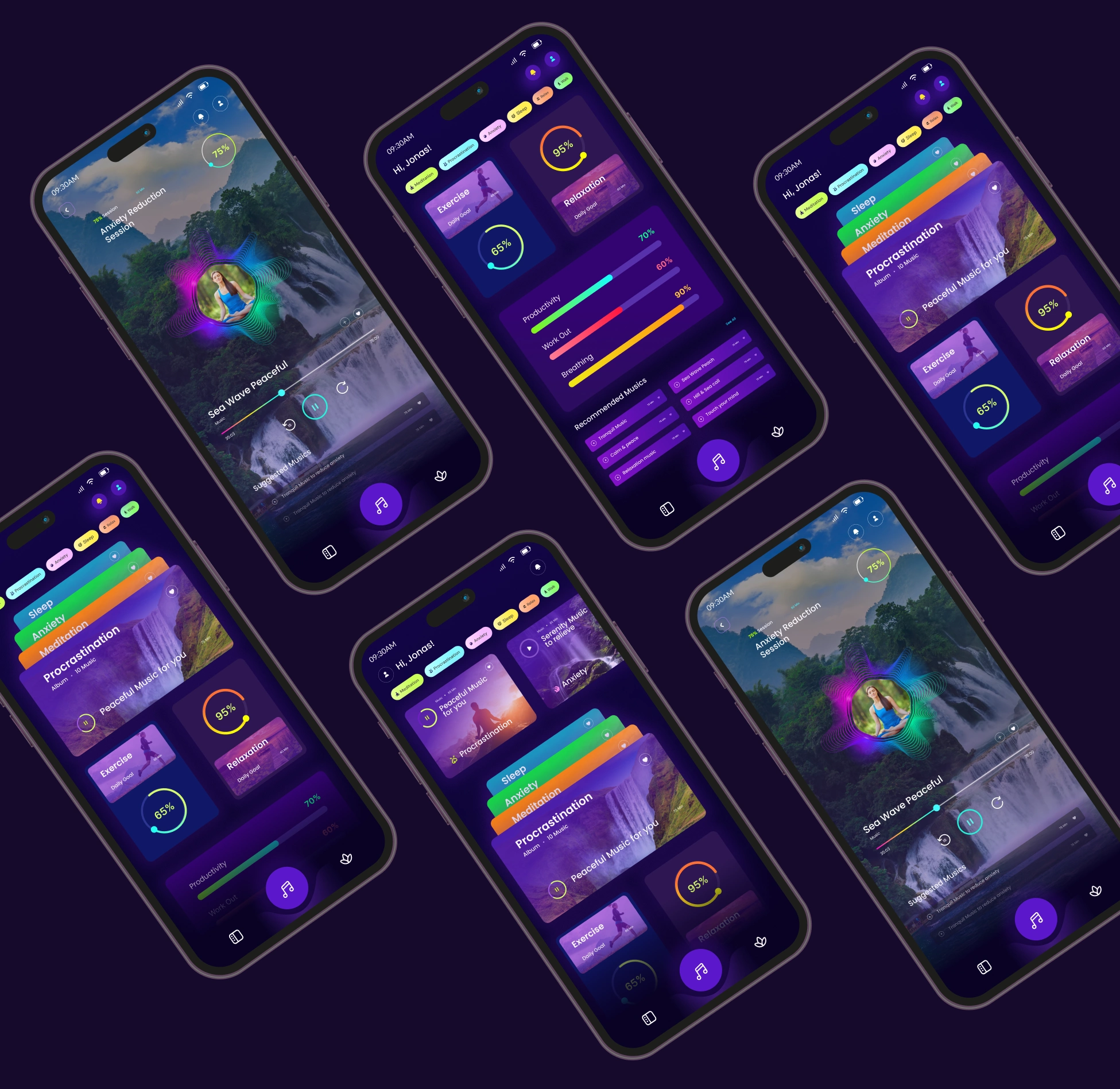 Color Palette: Calming gradients (Purple, soft purple, white, light other color ) for serenity, complemented with energetic accents (green, orange) for workouts.