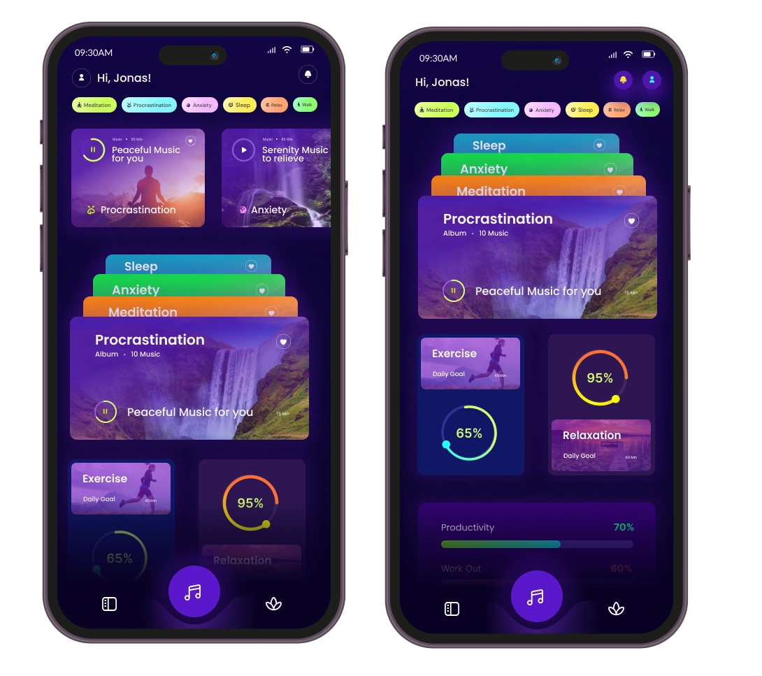🎧 Audio Player – Simple playback with categories like Focus, Sleep, Relaxation.