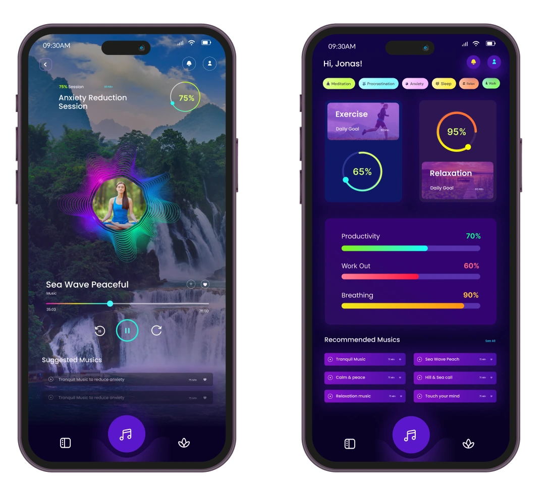 The Mobile App that combines serenity audio experiences with wellness and workout tracking to create a holistic lifestyle companion. The goal was to empower users to not only relax through curated audio but also track their physical activities, mood, and overall wellness—bridging mindfulness and fitness in one seamless experience.