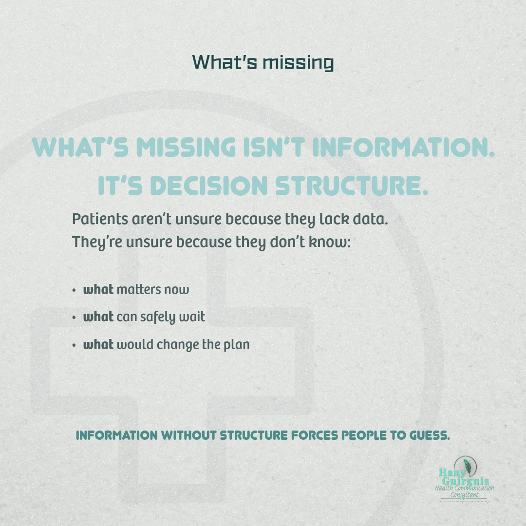 Patients are left unsure what matters now, what can safely wait, and what should trigger action.